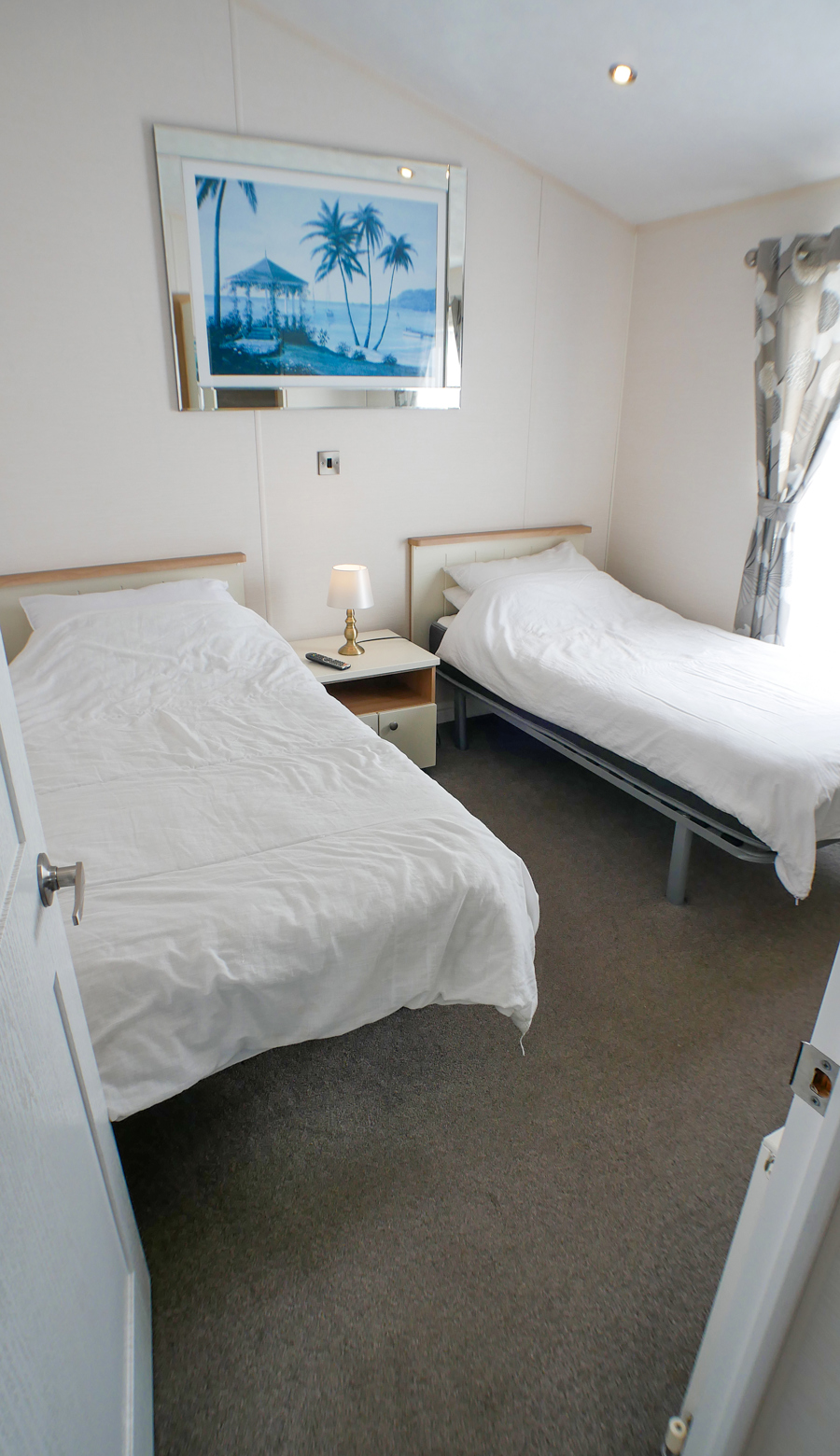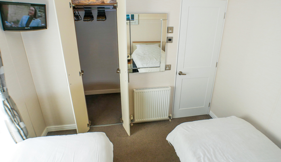 The twin bedroom is fitted with walk in wardrobes, vanity dresser, flat screen TV, free view and DVD. (blow up bed can be found within the walking wardrobe.