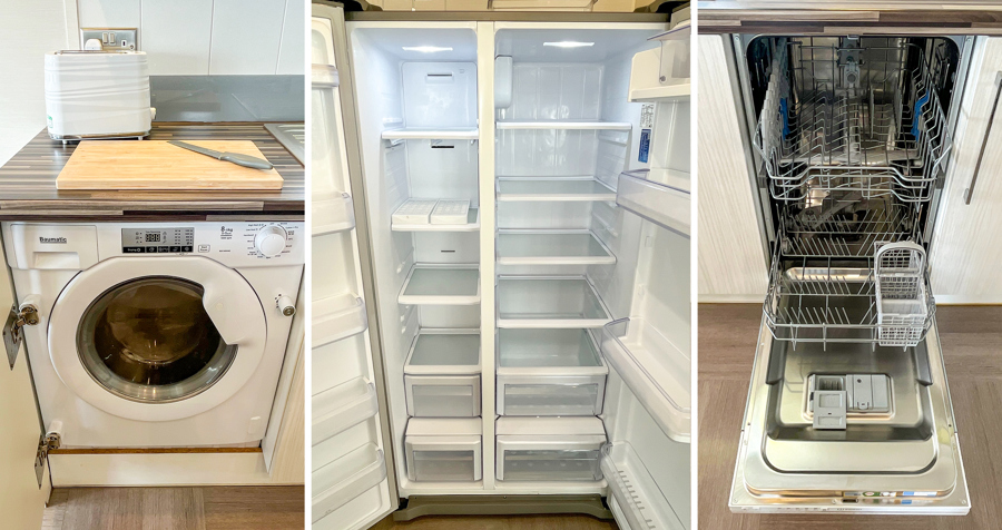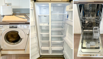 KITCHEN & DINING AREA: Equipped with necessary standard utensils, dishwasher, washing machine, microwave, amble storage, American fridge freezer, double gas oven and grill. Free standing table with 4 high back chairs, breakfast bar with 2 bar chairs.