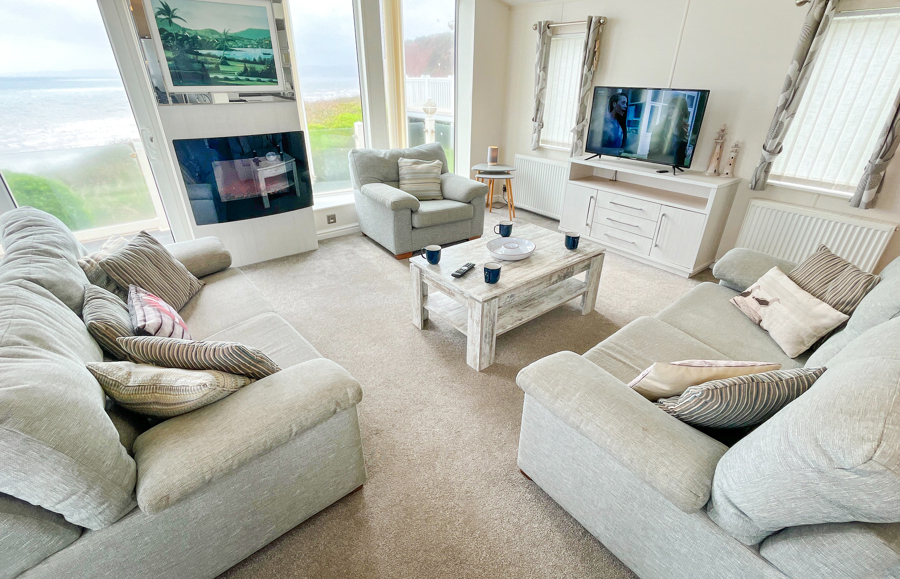 LOUNGE: Open plan with two & three-seater sofas and chair. French doors, Flat screen TV with Freeview and DVD player. Electric fireplace and radiator. An occasional blow up bed is supplied for those extra guests.