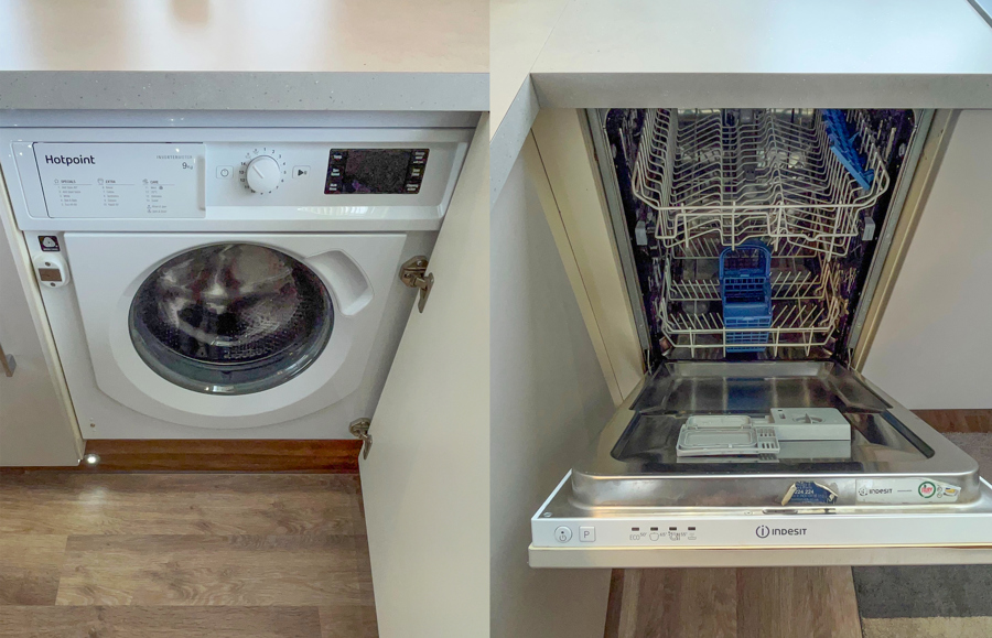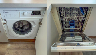 KITCHEN & DINING AREA: Equipped with necessary standard utensils, microwave, integrated fridge freezer, dishwasher, washing machine, gas oven and grill. The dining area benefits from free standing dining table and 4 high back chairs.