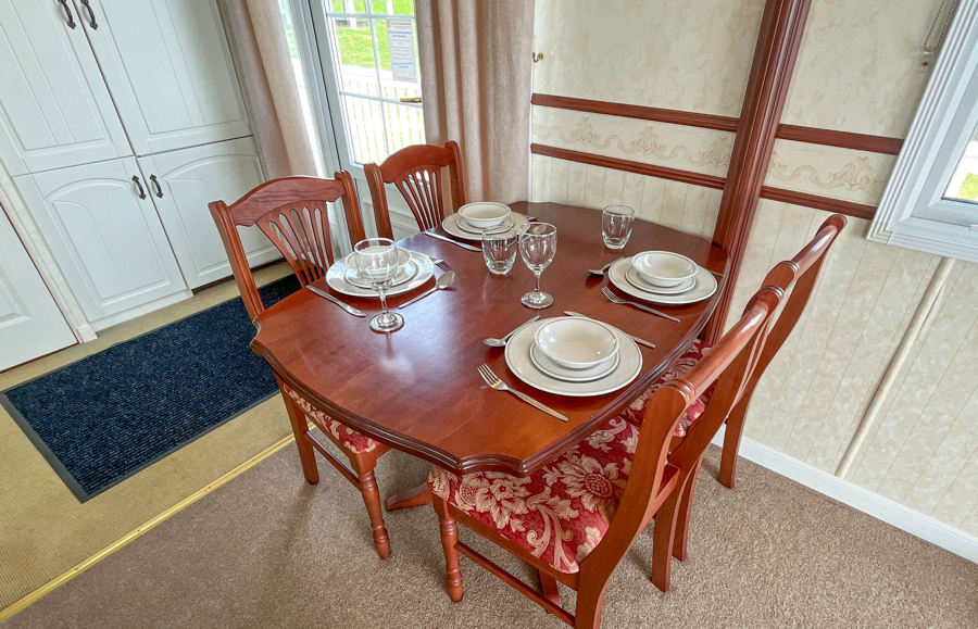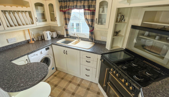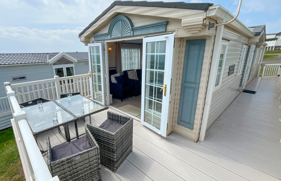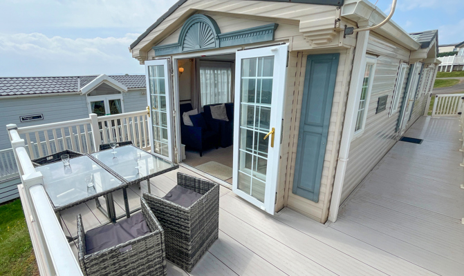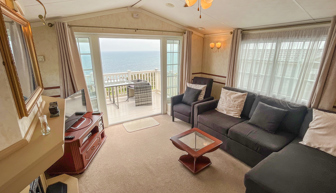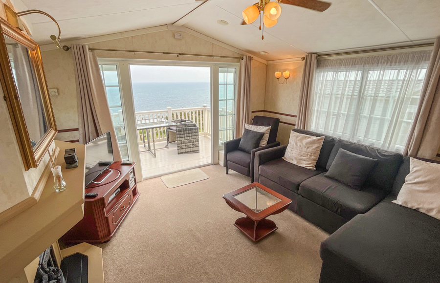 LOUNGE: CD9 has French doors which open onto a veranda with stunning sea views. This holiday home benefits from a comfortable lounge furnished with free standing 3 piece suite, 32" TV, DVD player & Freeview and electric flame effect fire. The lounge includes an occasional pull out sofa bed.