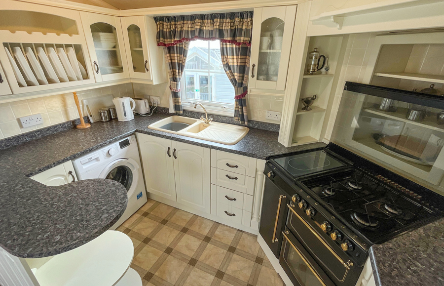 KITCHEN & DINING AREA: The kitchen includes a washing machine, full size integrated fridge / freezer, superb range cooker with hotplate & electronic ignition and microwave. The dining area comes complete with free standing dining table & chairs.