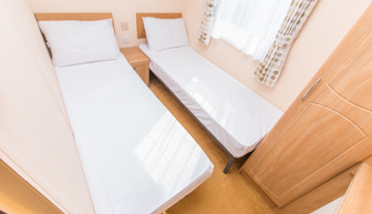 BEDROOMS: This accommodation has three bedrooms, one double with wardrobe and two twin rooms, (one twin bed can also be folded away and stored under the remaining bed to allow more room if required for a further travel cot).