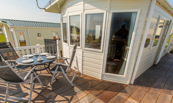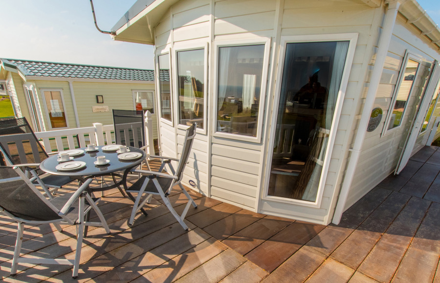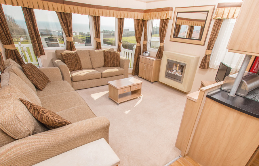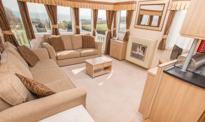 LOUNGE: This holiday home benefits from a comfortable lounge furnished with free standing furniture and benefits from sea facing windows and excellent views. KP99 has a LCD TV, DVD, CD player, free view, fixed units and a contemporary electric fire.