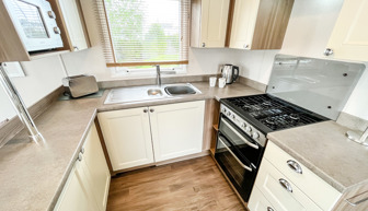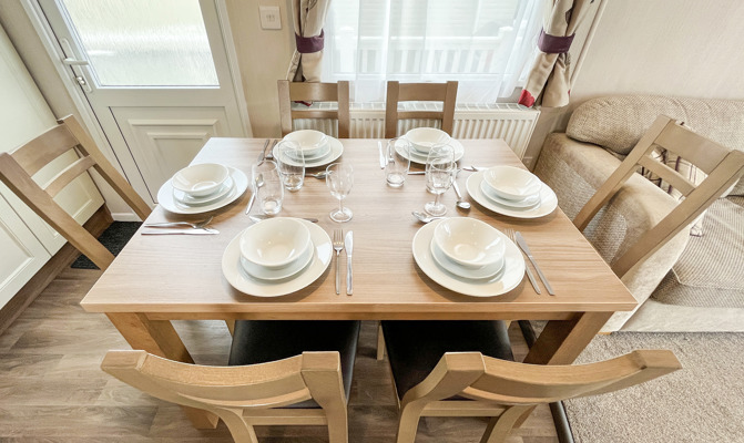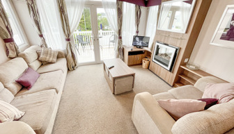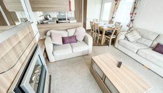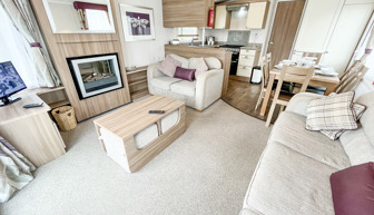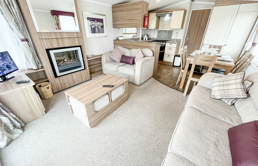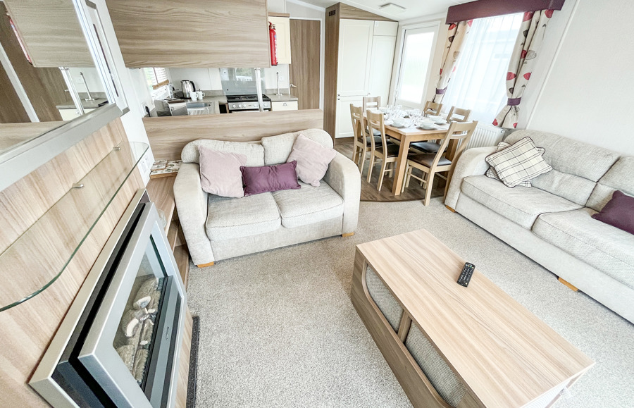LOUNGE: Incorporates free standing domestic style comfortable sofa and two swivel arm chairs. This modern holiday home benefits from LCD TV, Free view, DVD and flame effect fire.