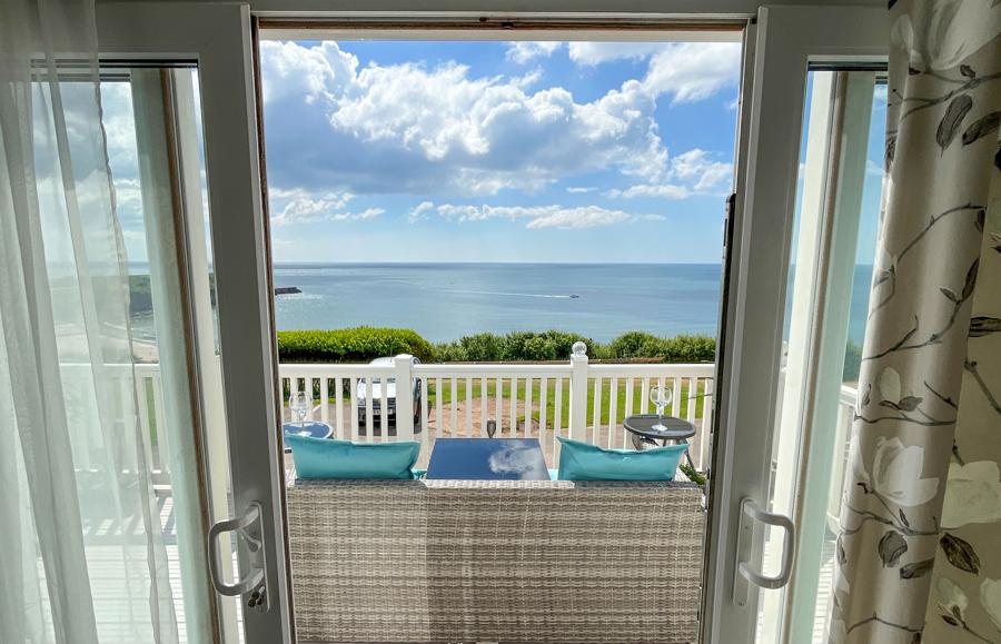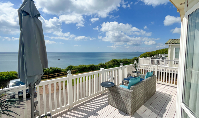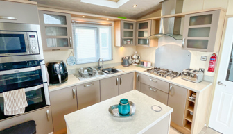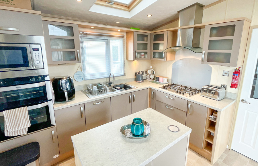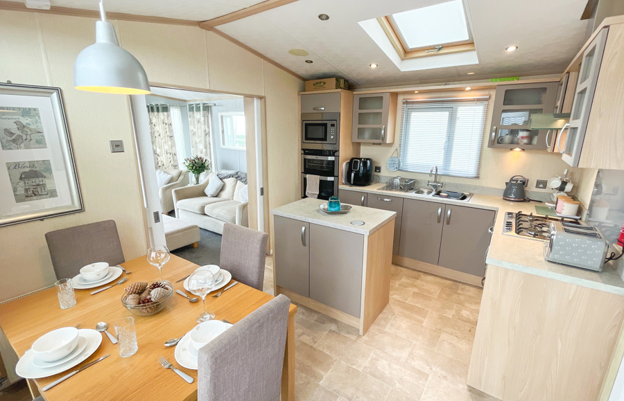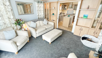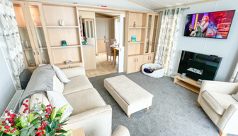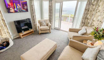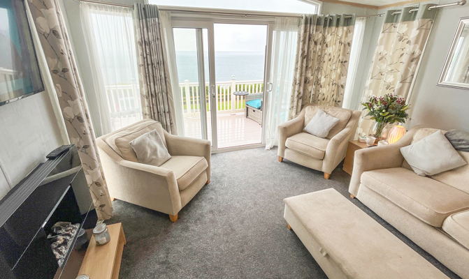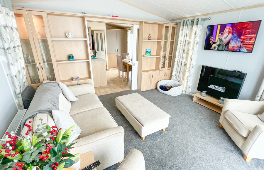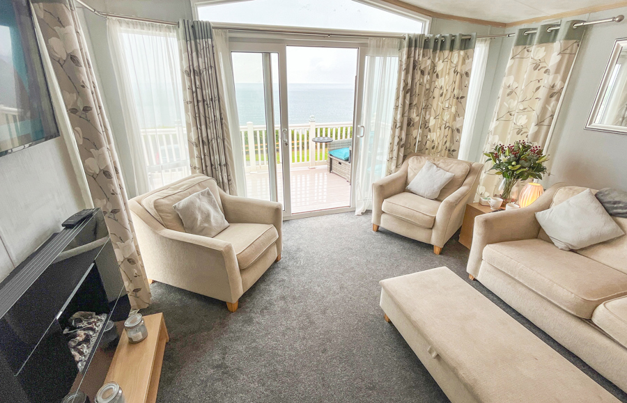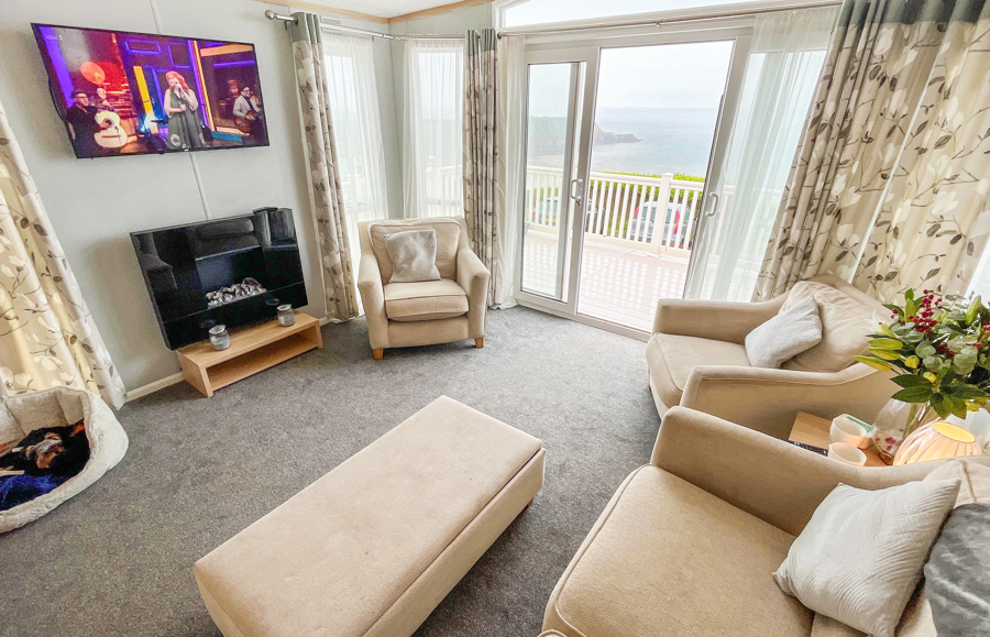 LOUNGE: The lounge includes free-standing furniture, patio doors opening onto the gated veranda with sea views, wall mounted 42” TV, DVD, Free view, electric fire and sliding doors to separate the lounge and kitchen area.