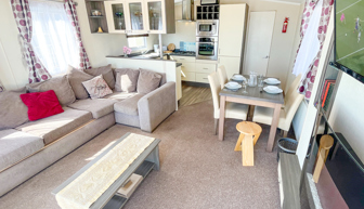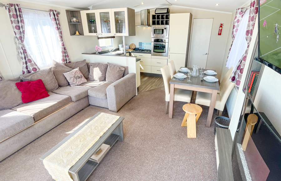 LOUNGE: This holiday home benefits from flat screen TV, DVD, Free view, coffee table, upholstered cube stools, flame effect fire. Please be advised that there is not an occasional pull out bed fitted in the sofa.