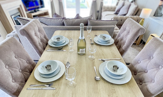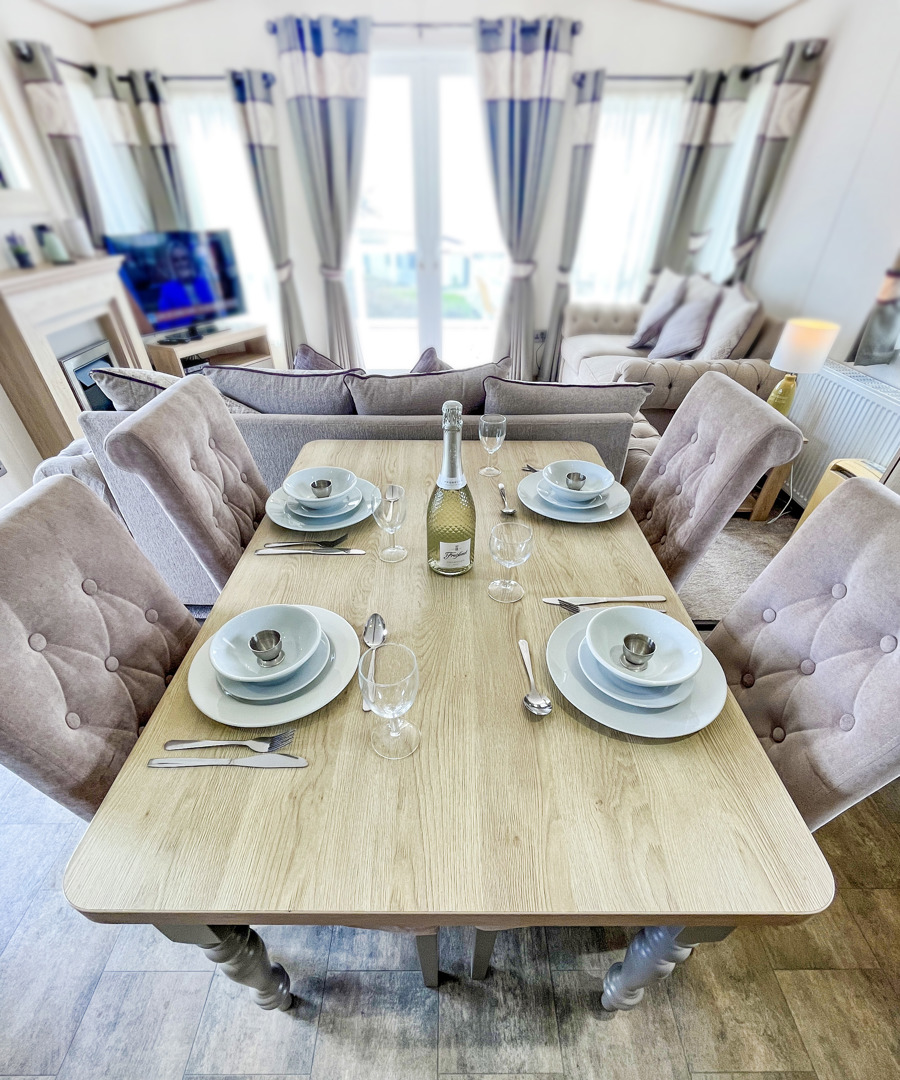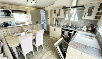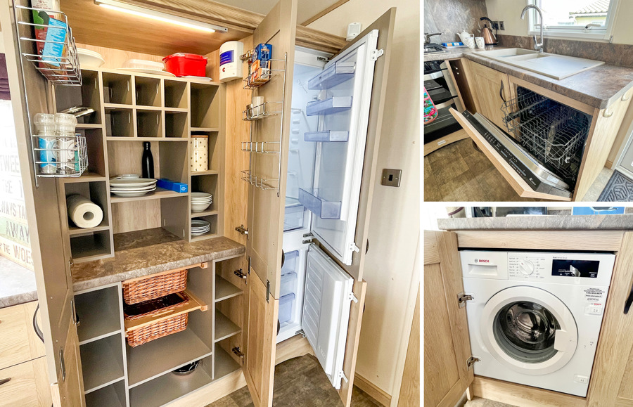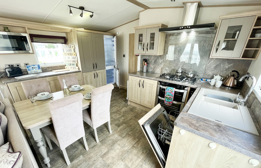 KITCHEN & DINING AREA: Fitted kitchen furnished with full size integrated fridge and freezer, microwave, hob, cooker and extractor fan. TT22 also includes a washing machine and dishwasher. The dining area benefits from a free standing table and 4 chairs.