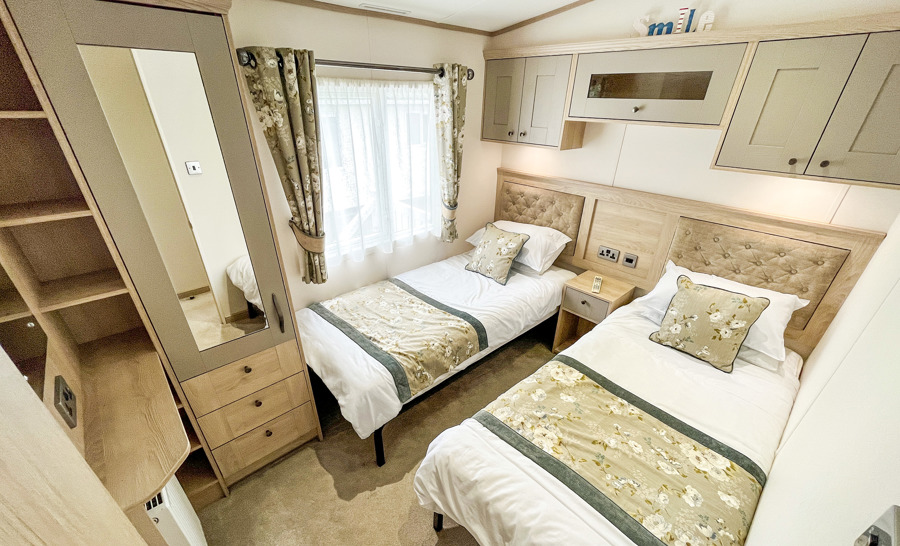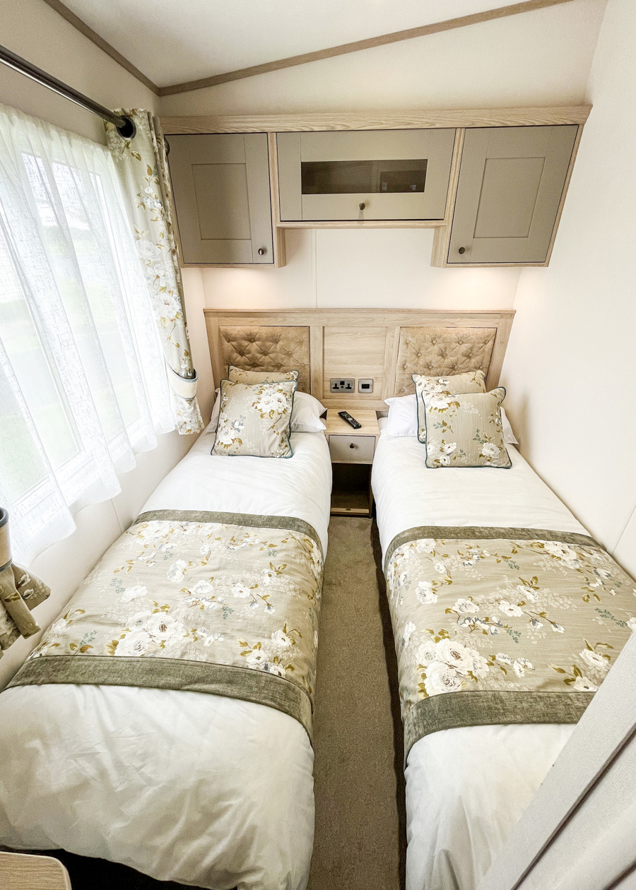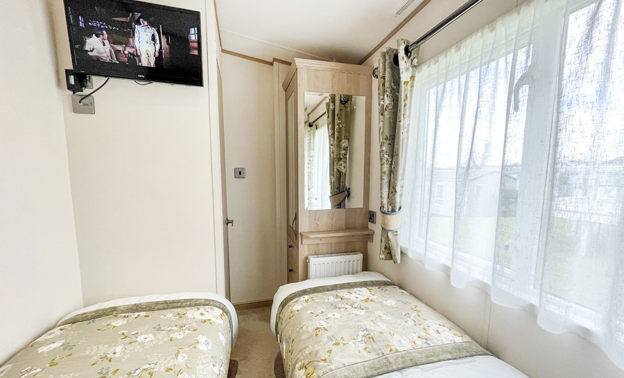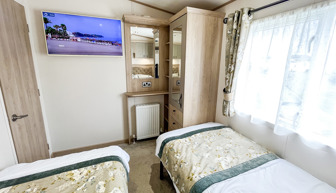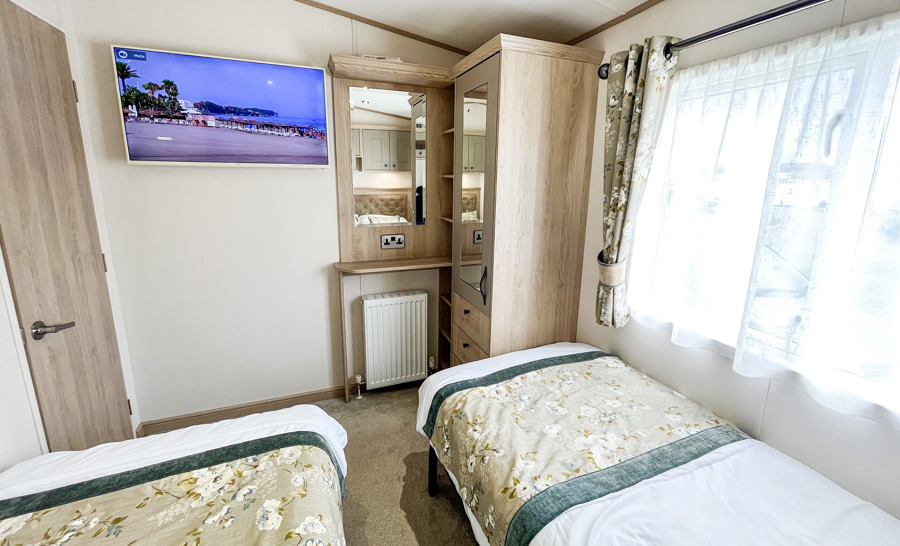 BEDROOMS: This accommodation has three bedrooms, one king size with fitted wardrobe, usb electric sockets, en-suite toilet & shower, room for a travel cot, wall mounted TV and vanity area. The two twin rooms are complete with 3ft beds, wardrobes, usb electric sockets, wall mounted TVs and small vanity area. TT22 can accommodate a maximum of 6 guests.