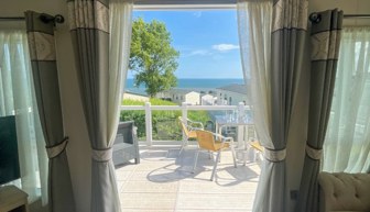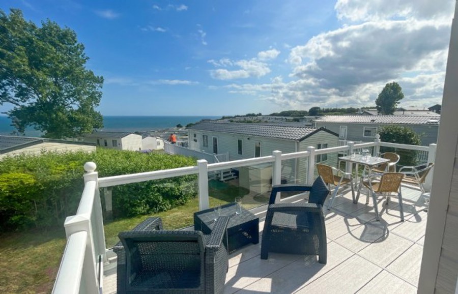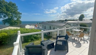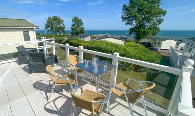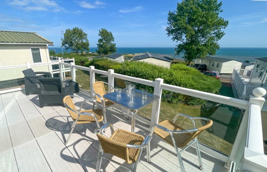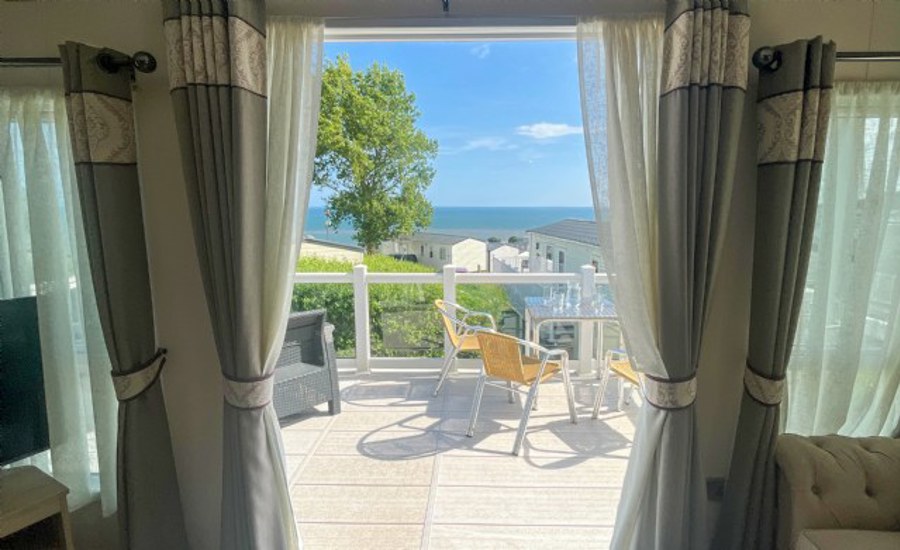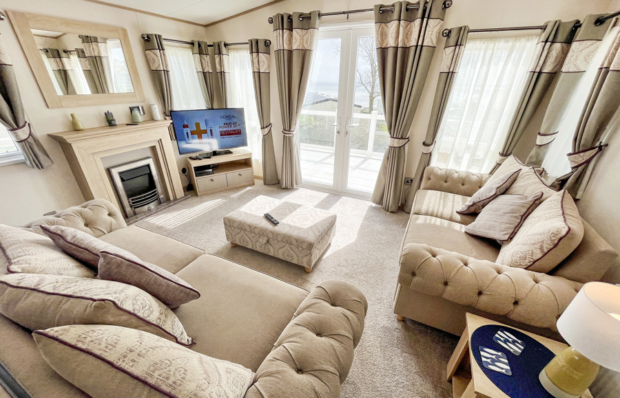 LOUNGE: The lounge includes 2 sofas, integrated radio and bluetooth sound system, usb electric sockets, electric fire place and an open plan feel with French doors leading on to the veranda to enjoy the sea views. This holiday home also benefits from fitted units with 43" TV and DVD player.