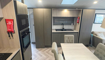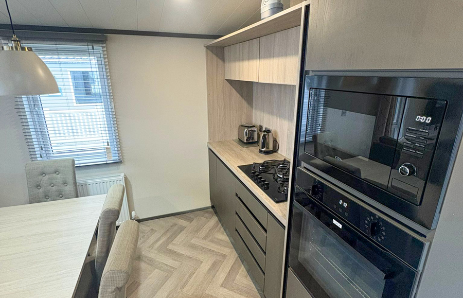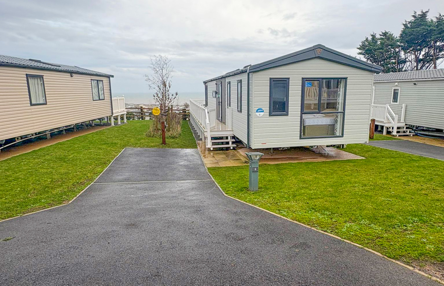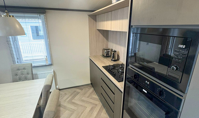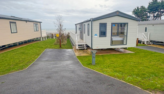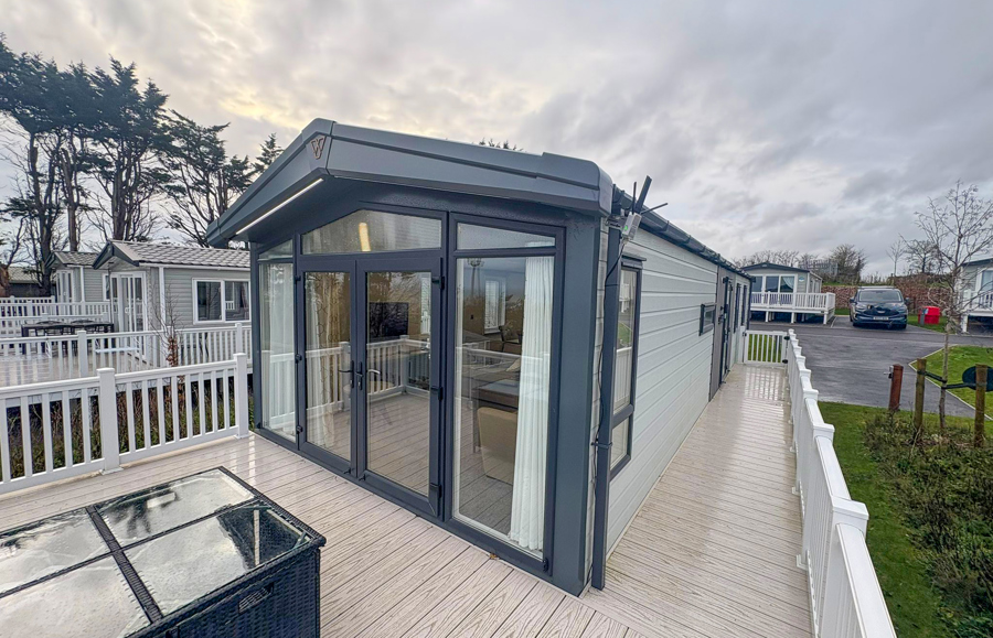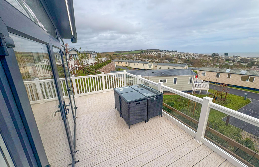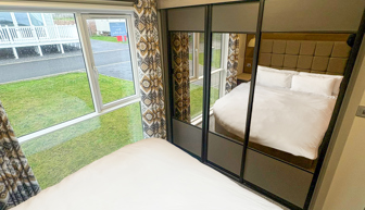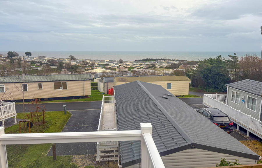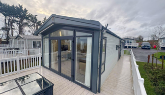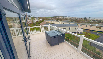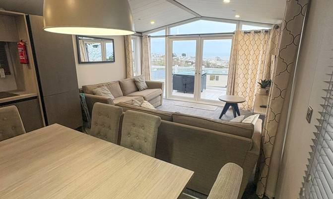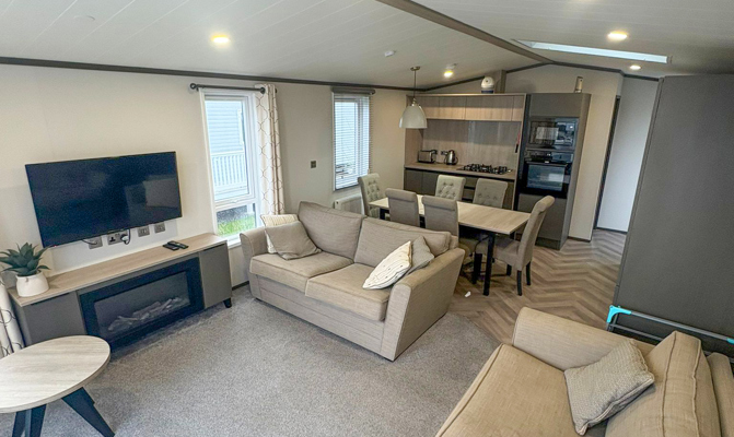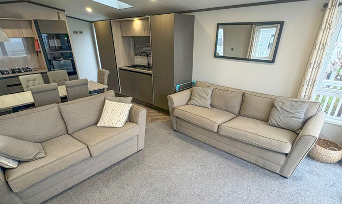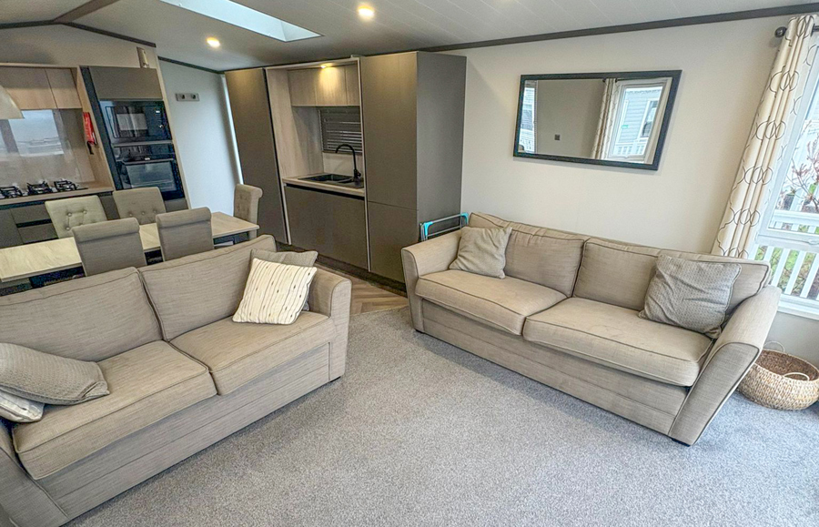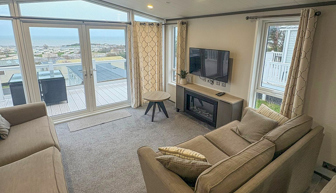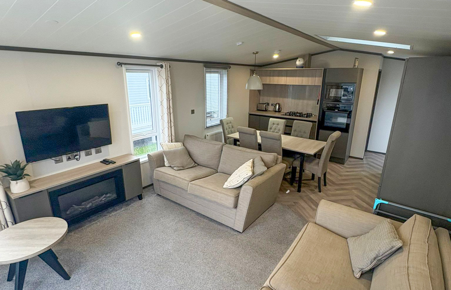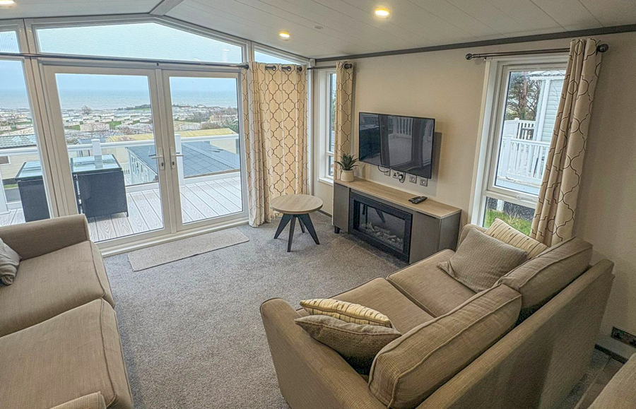 LOUNGE: This holiday home benefits from flat screen TV with Free view, 3 & 2 seater sofa, electric fire, as well as views out across the veranda. UD6 can accommodate a maximum of 6 people.