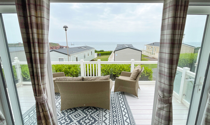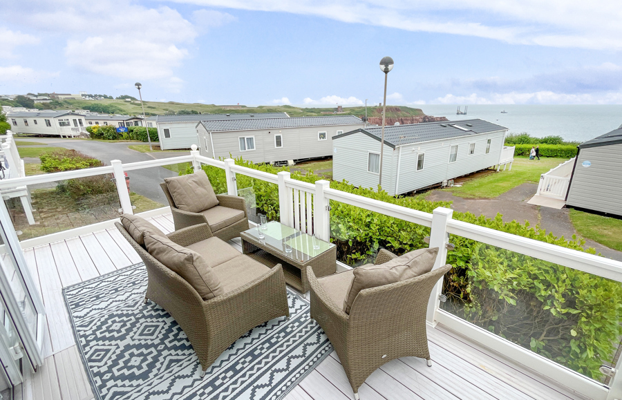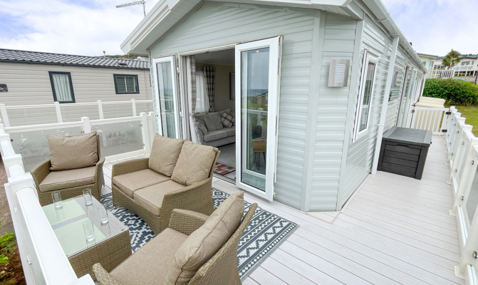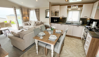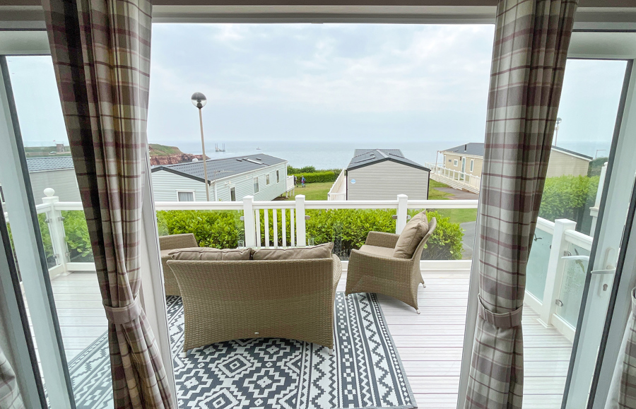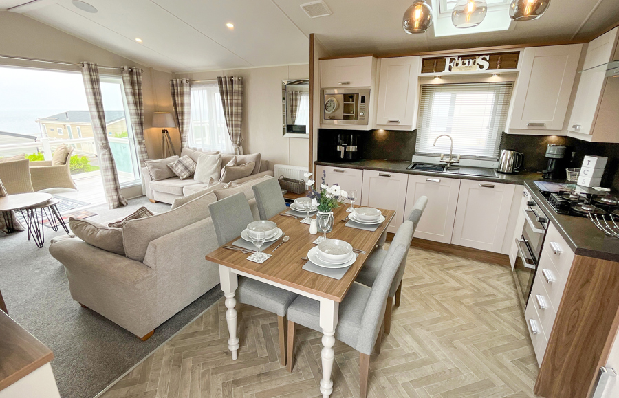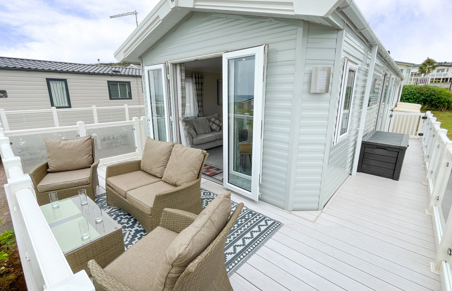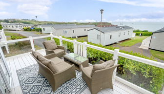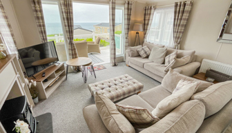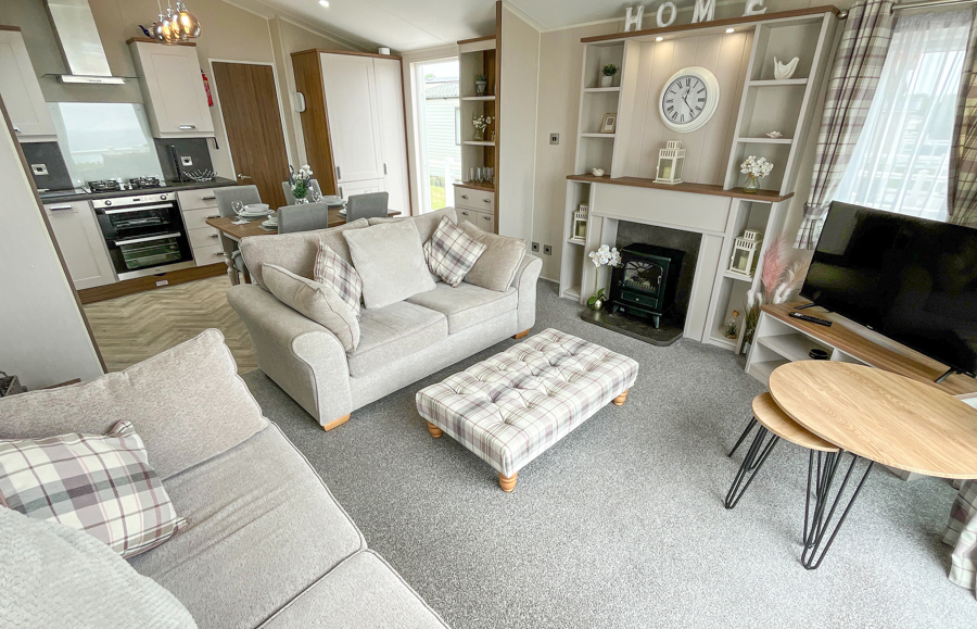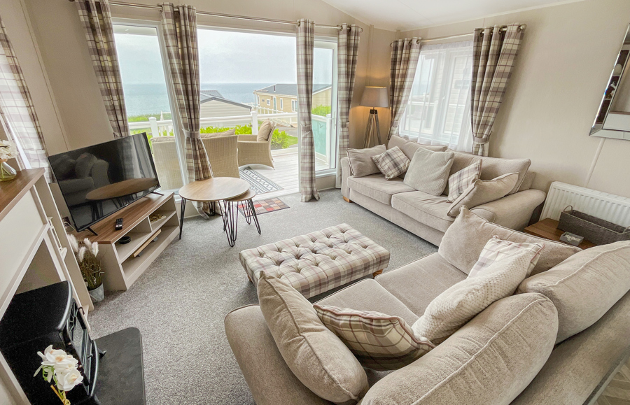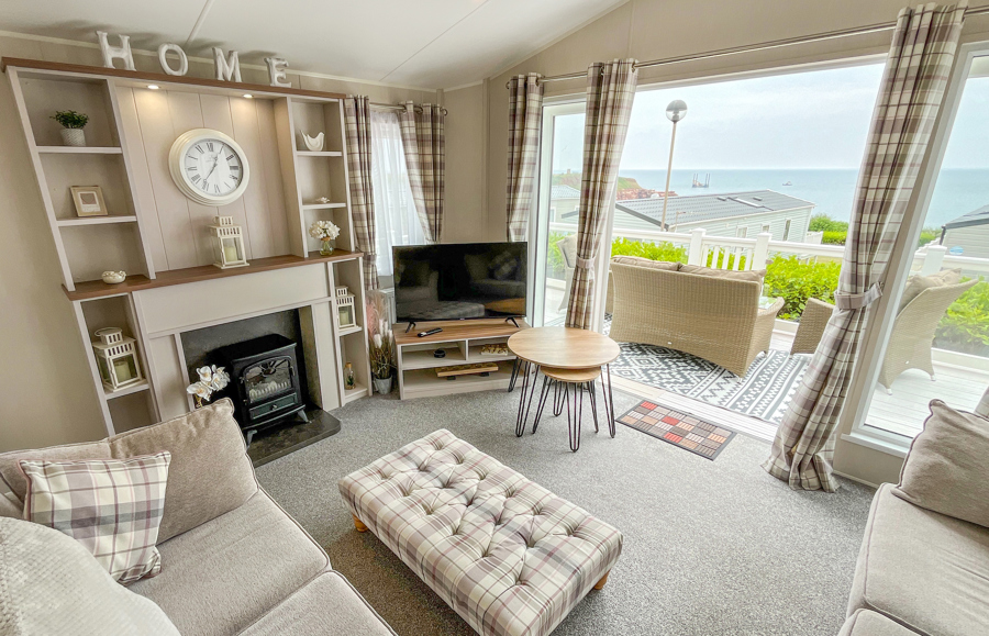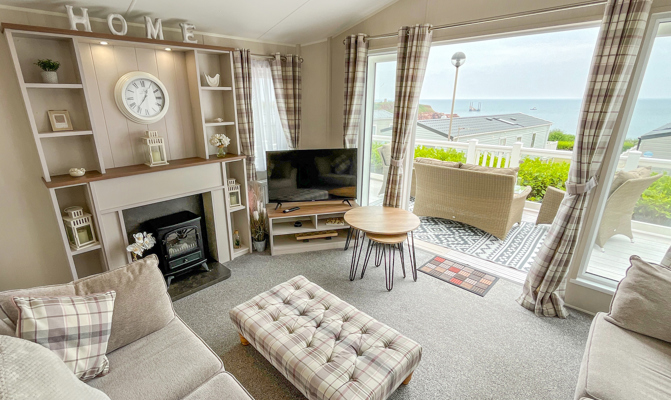 LOUNGE: The large open plan living has all the comforts of home, freestanding lounge suite and scatter cushions, TV with Freeview, fixed units and log burner effect electric fire, nest of coffee table and French doors opening onto the gated veranda with sea views.