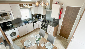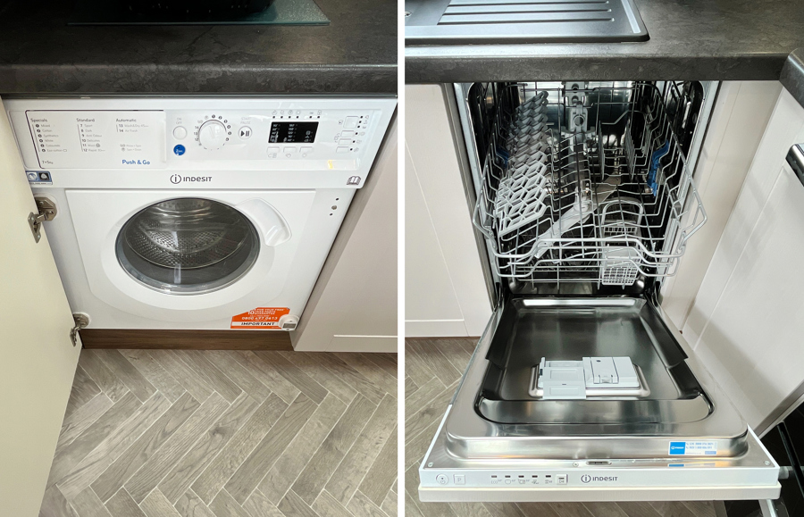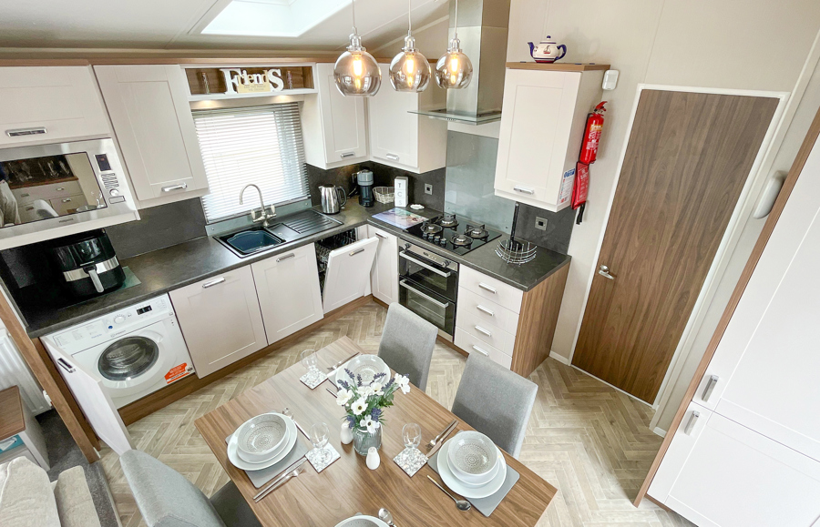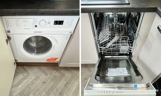 KITCHEN & DINING AREA: A modern kitchen that includes a gas cooker, plenty of cupboard space, integrated fridge freezer & microwave, dishwasher and washing machine. The dining area consists of a freestanding table and 4 chairs.