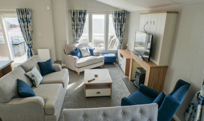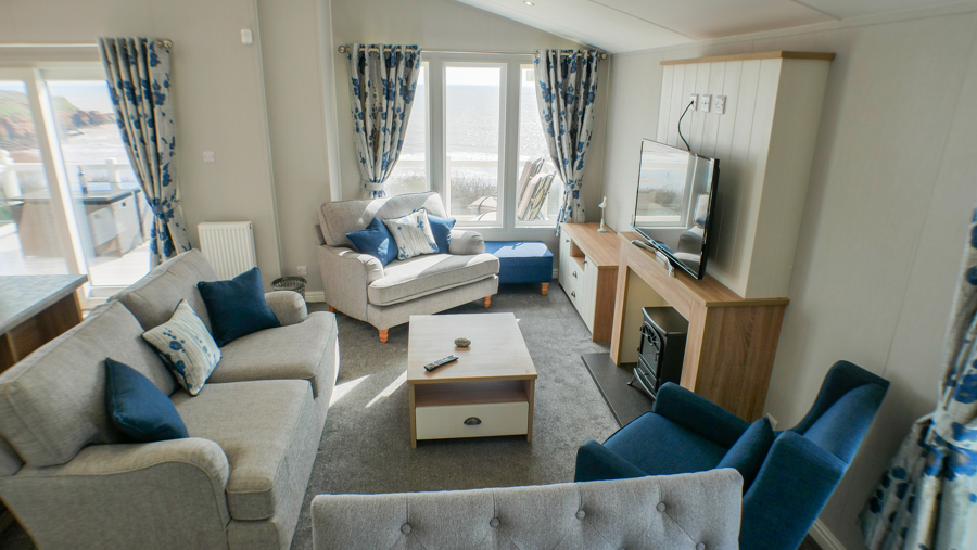 LOUNGE: Spacious open plan with sea views. comfortable seating, coffee table, wall mounted flat screen TV with Freeview and DVD player, electric fireplace and radiator.