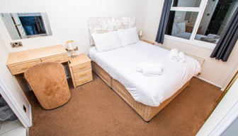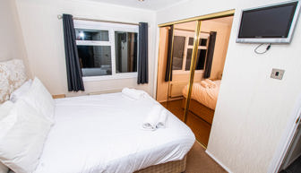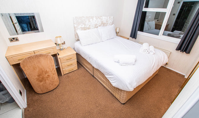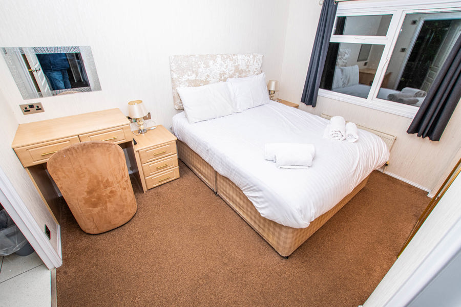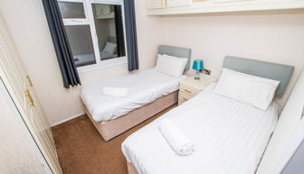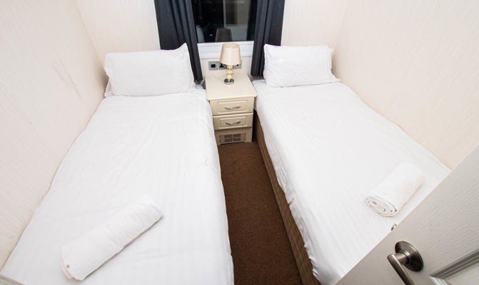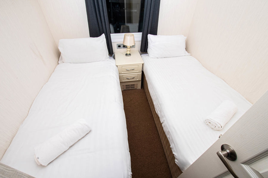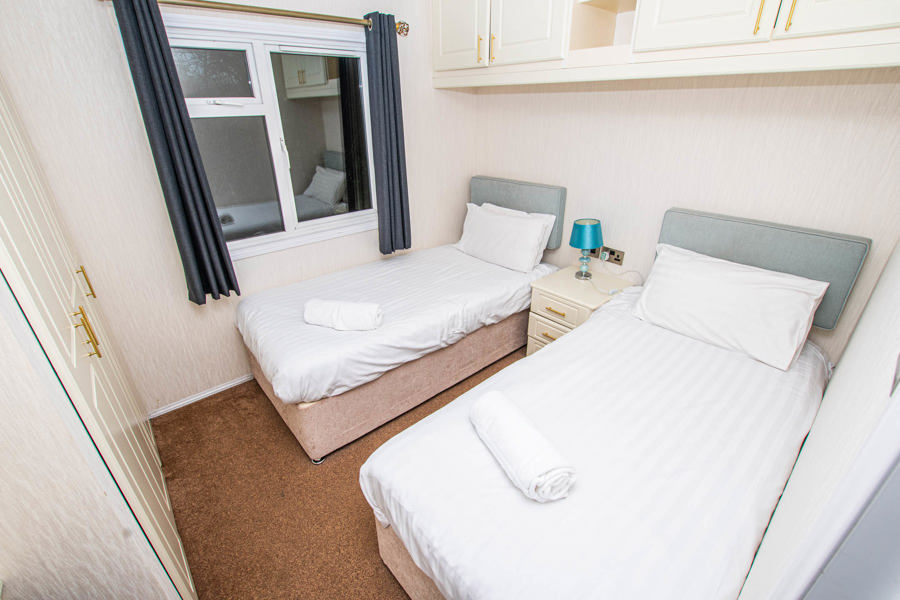 The first twin bedroom includes 2 twin beds with overhead storage, bedside table and fitted wardrobe. The second twin bedroom includes two single beds, bedside table and small fitted wardrobe. Maximum of 6 guests.