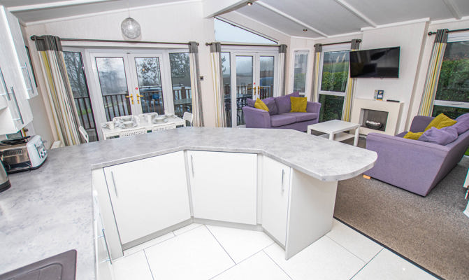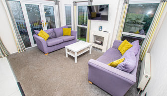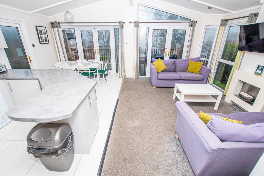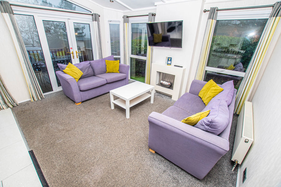 LOUNGE: Open plan with a two frees standing sofas,coffee table, electric fie, wall-mounted TV with freeview and patio doors leading to the veranda.