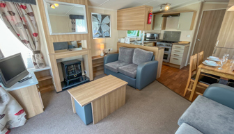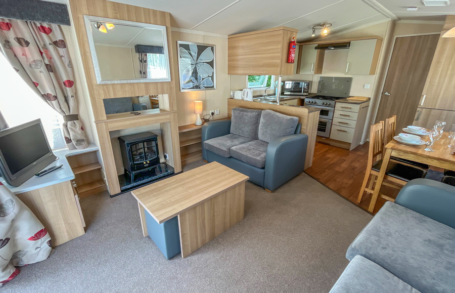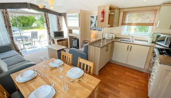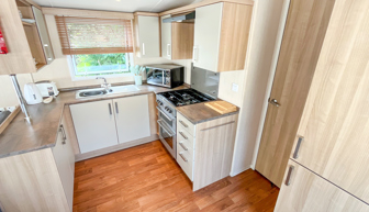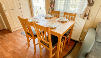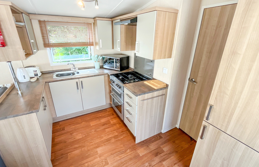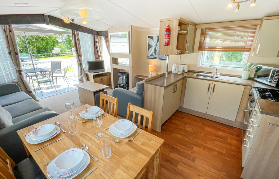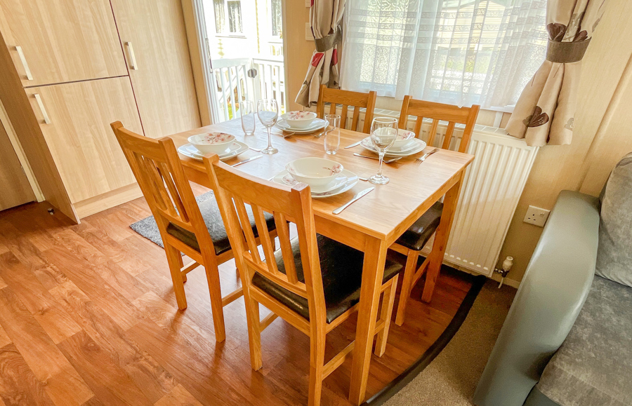 KITCHEN & DINING AREA: Equipped with necessary standard utensils, microwave, full size integrated fridge freezer, gas oven and grill. The dining area comes complete with free standing dining table & 4 chairs.