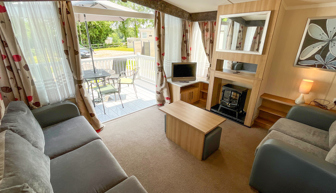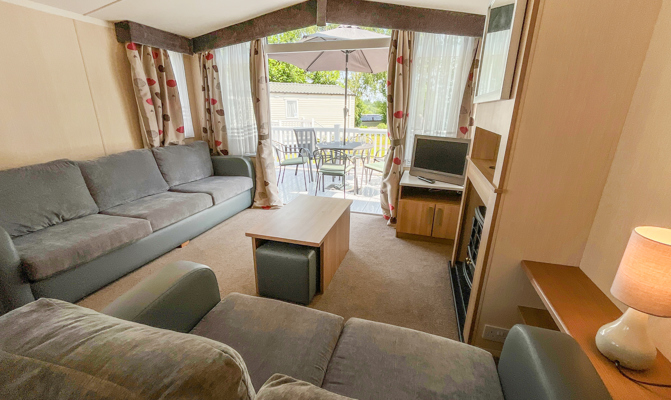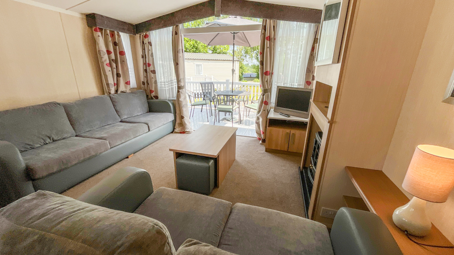 LOUNGE: Open plan design with 2 sofas, TV with Freeview, coffee table with foot stools, and French doors opening out onto the veranda.