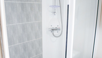 BATHROOM: Shower cubicle, toilet, and hand basin.