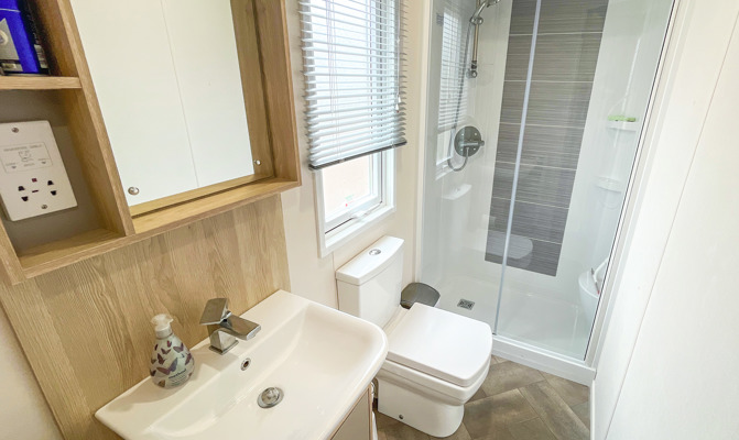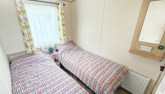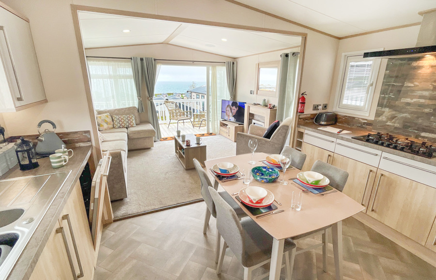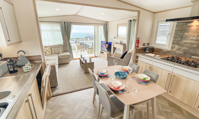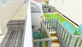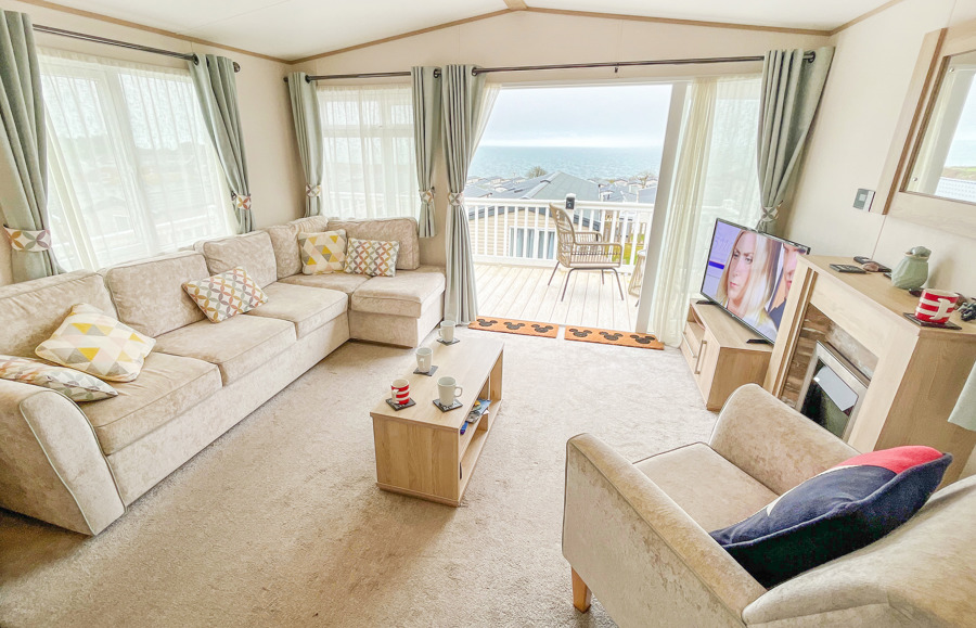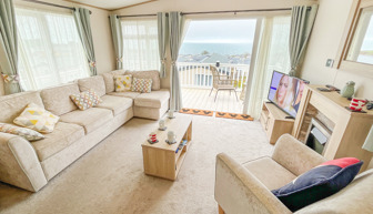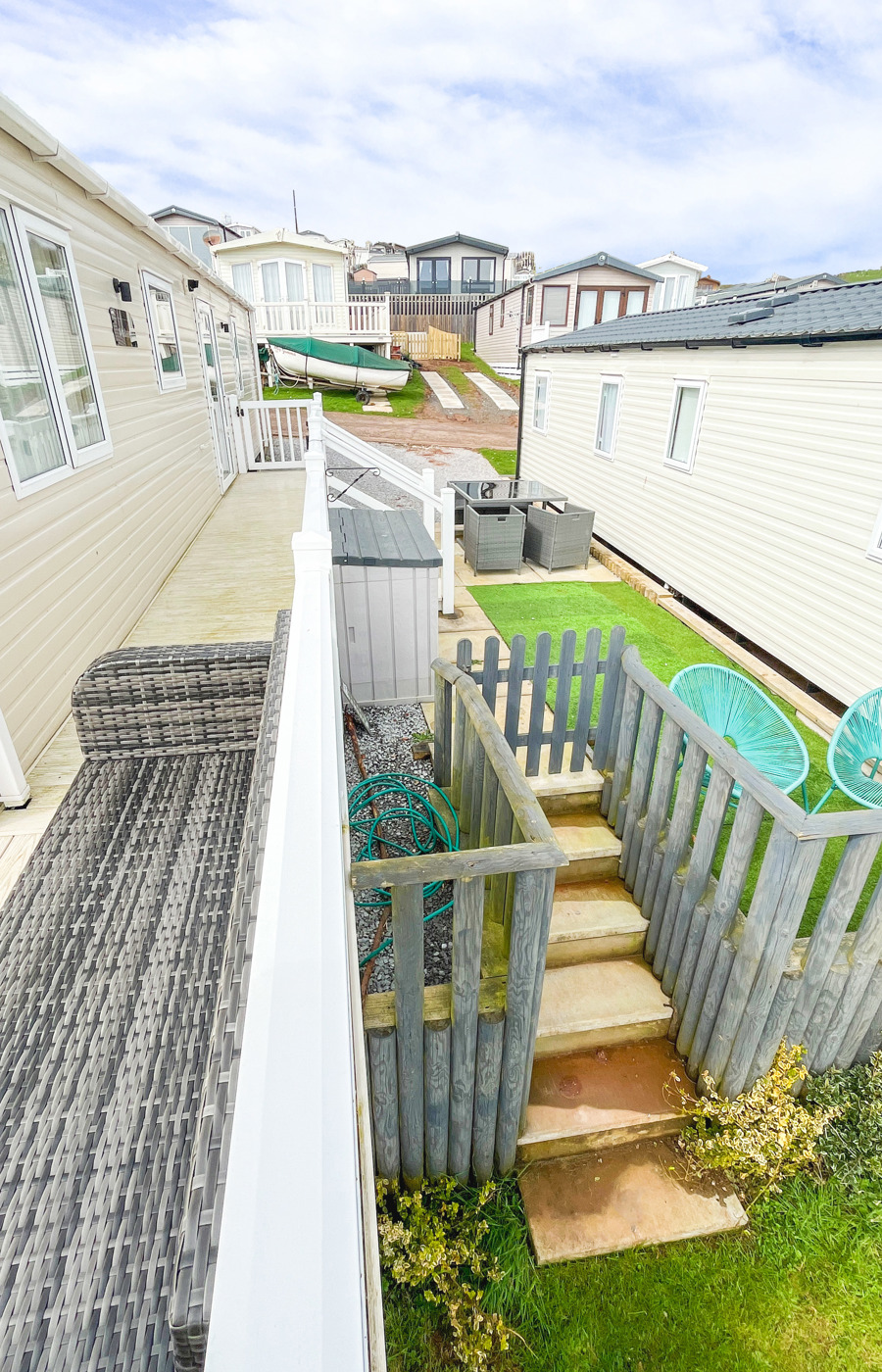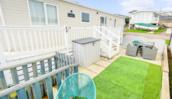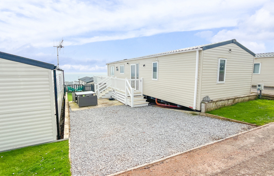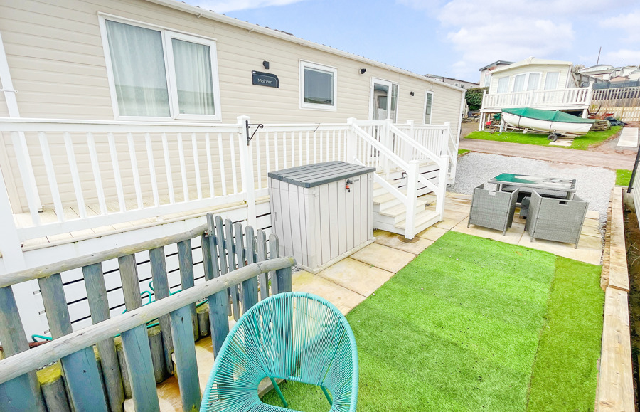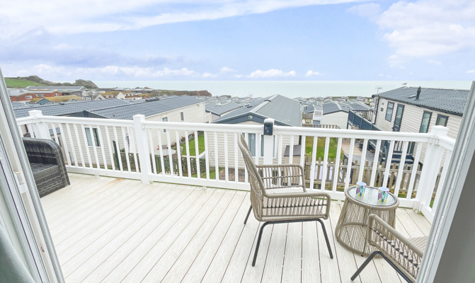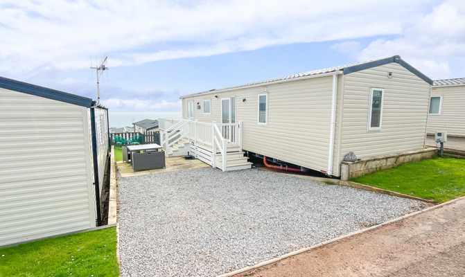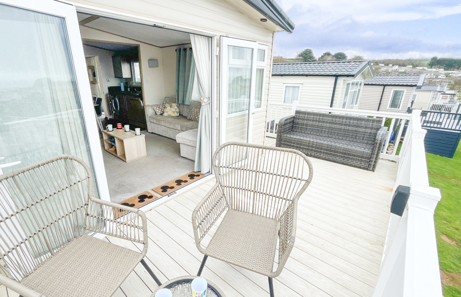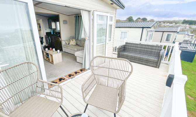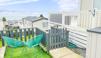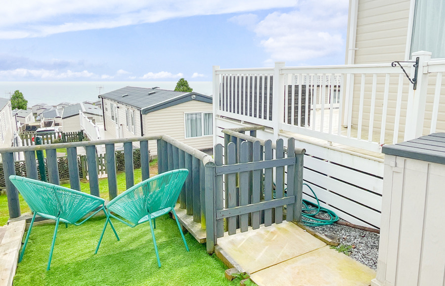VERANDA: The caravans French doors open to a spectacular sea-view from a gated front veranda with side walkway. Down the side there are 2 access points one to the private parking area and another to a paved patio area, that has partial sea-views. Seating is provided for both the veranda and patio area.