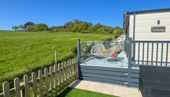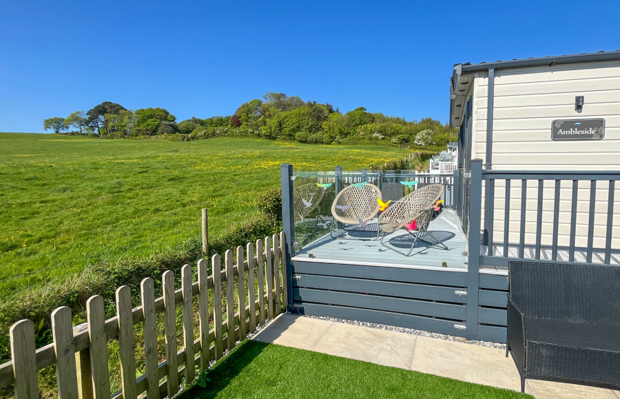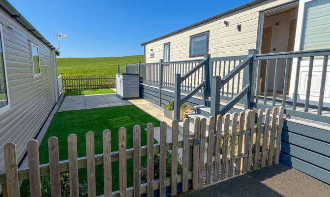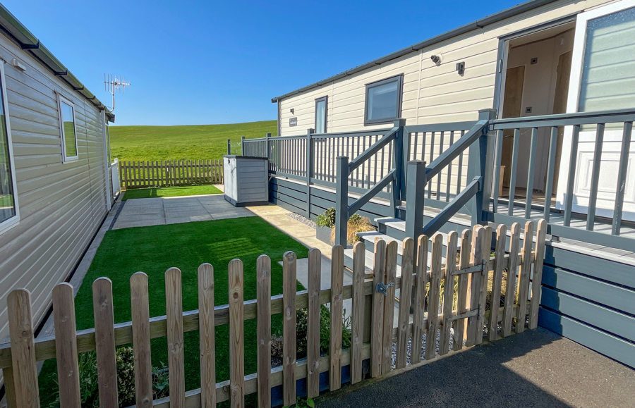 VERANDA: The caravans French doors open to a front veranda with side walkway. There is also a fenced garden with laid with AstroTurf.