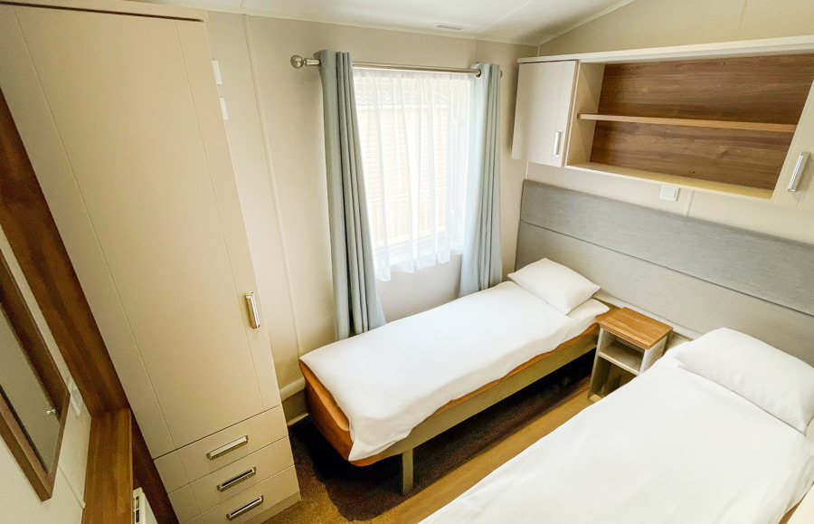 The twin room includes 2 single beds, wardrobe, overhead storage and bedside cabinet. There is also an occasional pull-out bed in the lounge to accommodate the extra guests. D34 can accommodate a maximum of 6 guests.