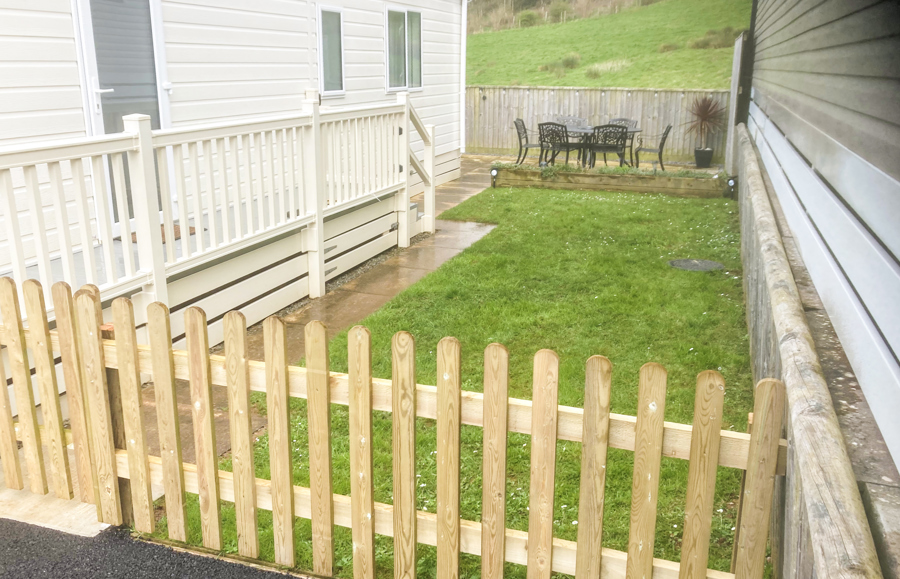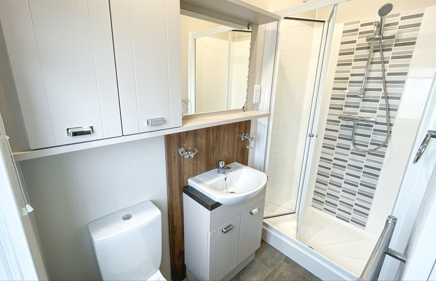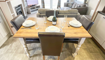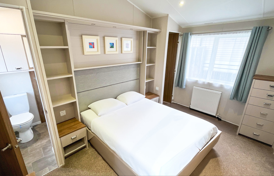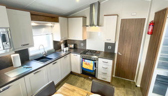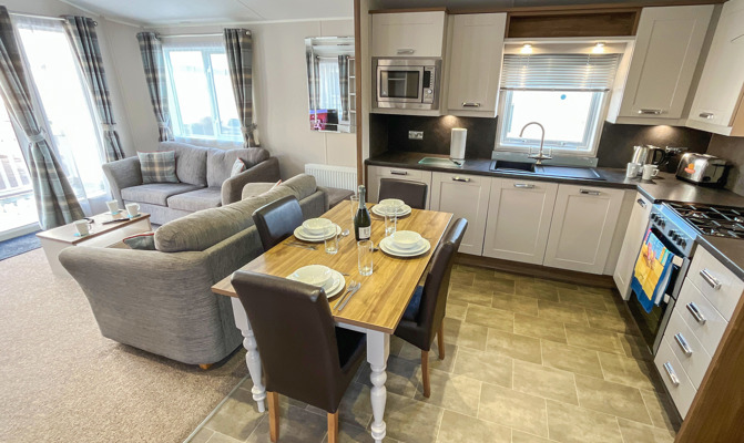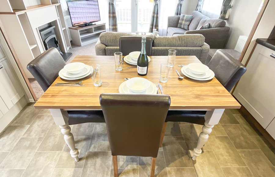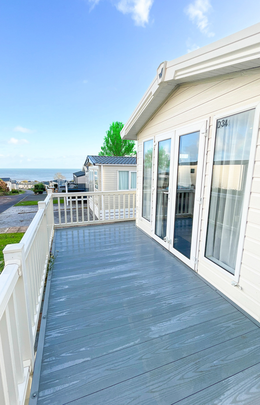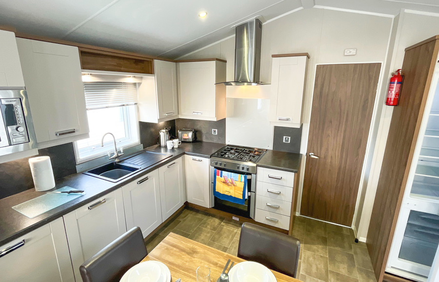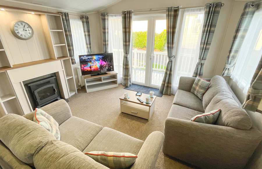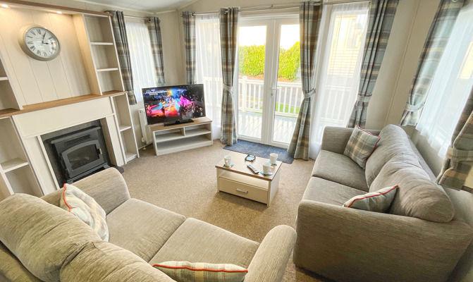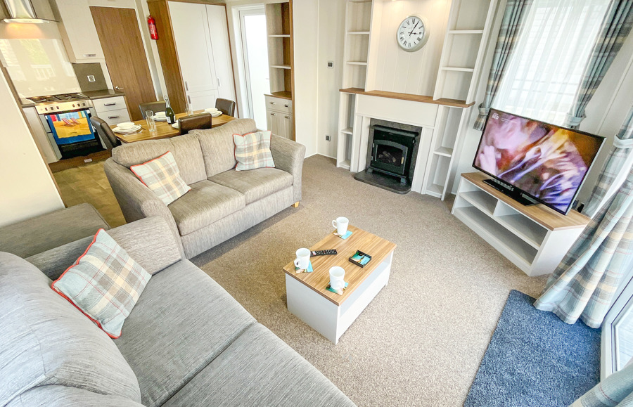 LOUNGE: Spacious open plan with 2 free standing sofas, French doors on to the veranda, flat screen TV with Freeview, DVD player, coffee table and electric log burner. Occasional pull-out bed is fitted for those extra guests. D34 can sleep a maximum of 6 guests.