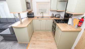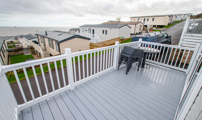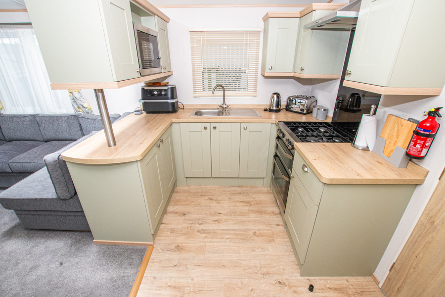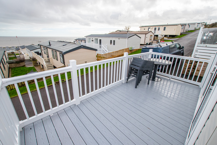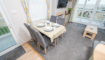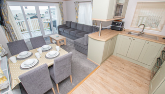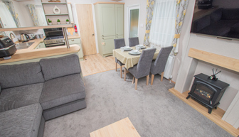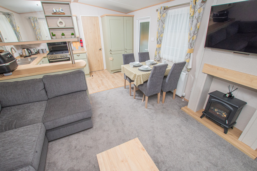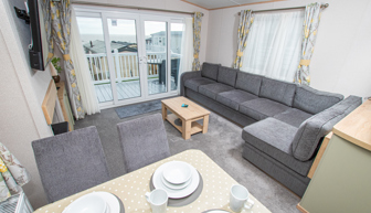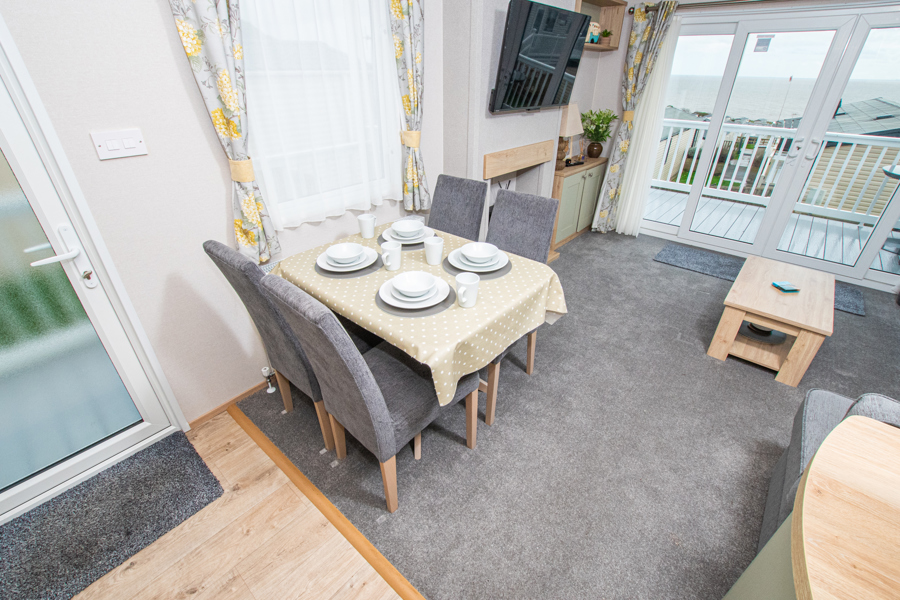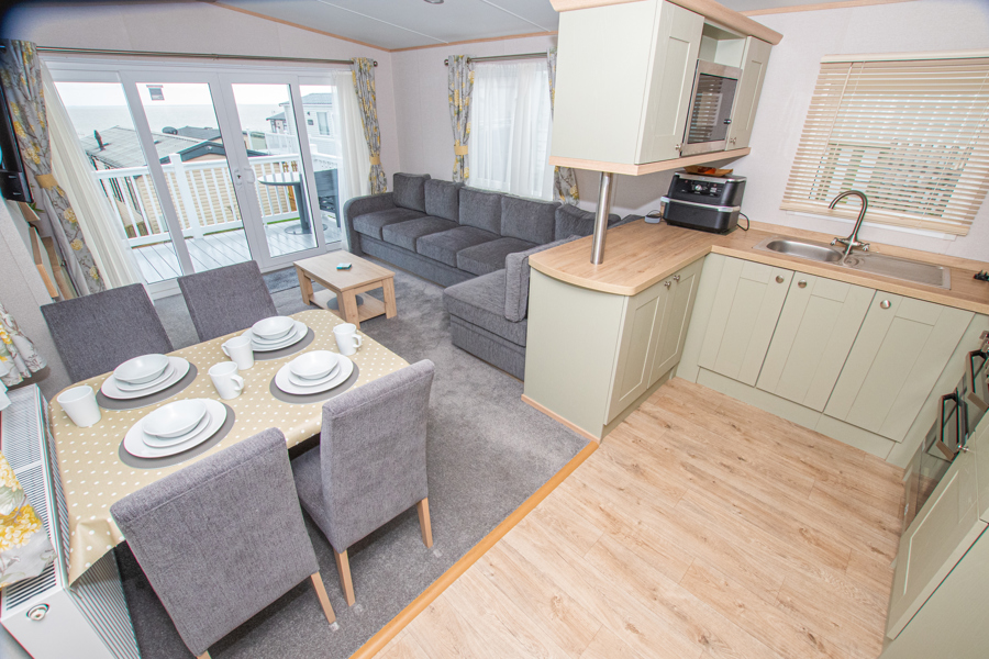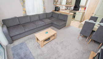 LOUNGE: Open plan with fixed L-Shape seating, patio doors leading to the veranda with sea views, coffee table, flat screen TV, electric fire. The sofa includes an occasional pull-out sofa bed for those extra guests. C131 can accommodate a maximum of 6 people.