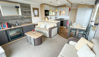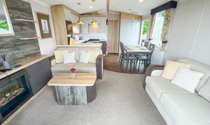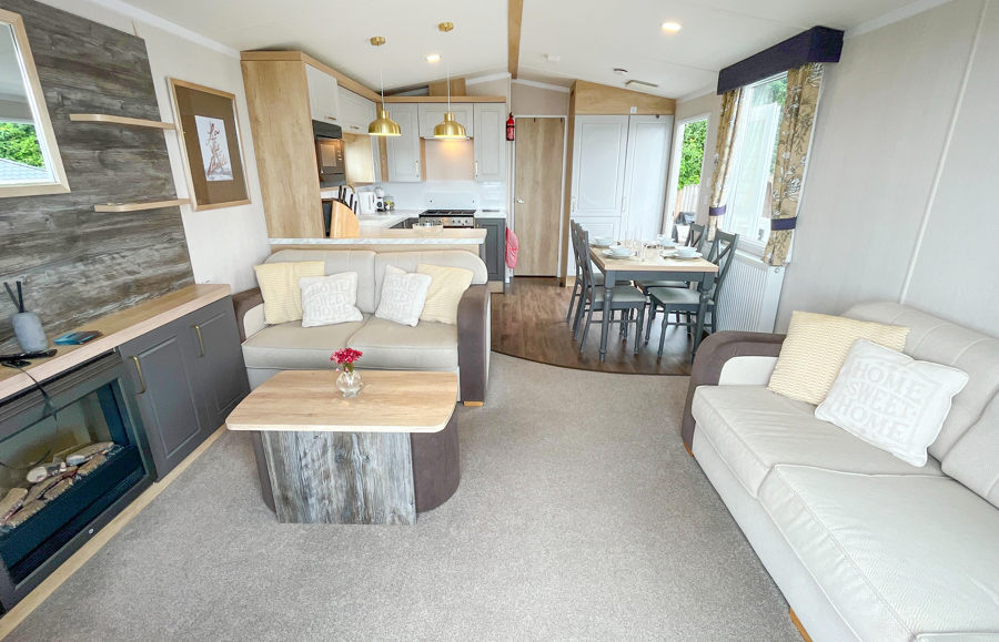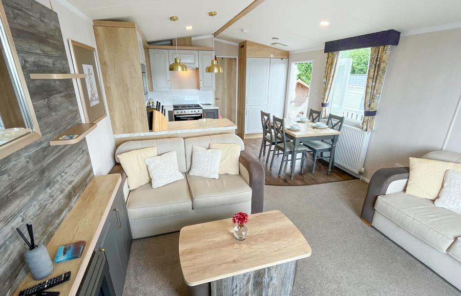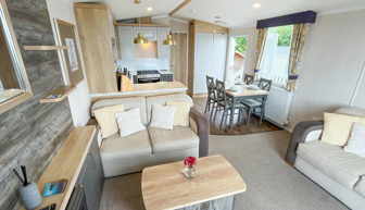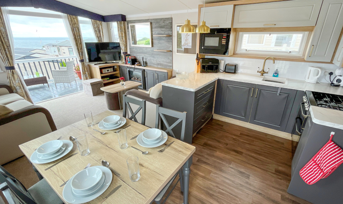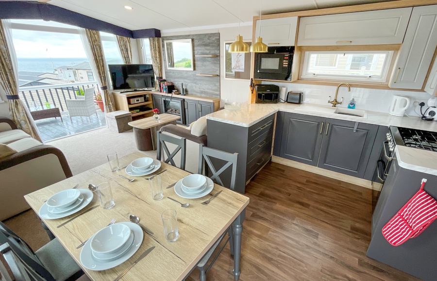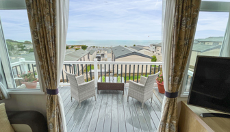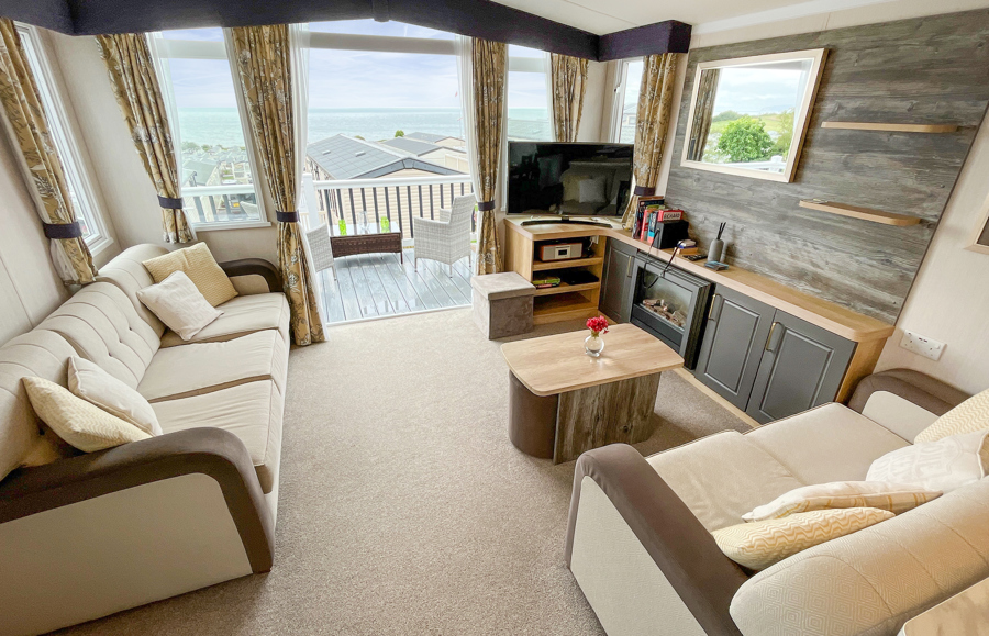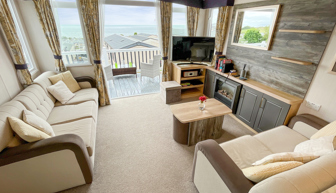 LOUNGE: Open plan with 2 sofas, French doors on to the veranda with sea views, coffee table with two foot stools and Flat screen TV with Freeview. The sofa includes a pull out occasional bed allowing C133 to accommodate a maximum of 6 people.