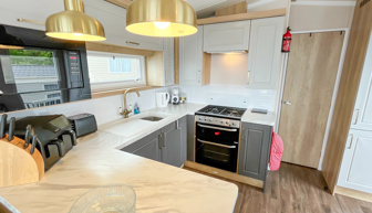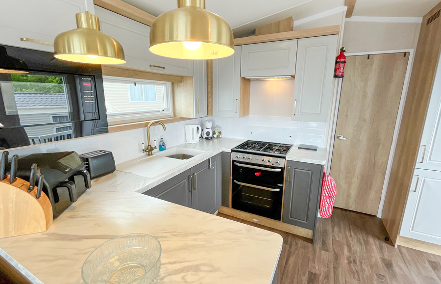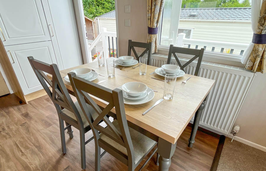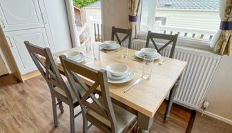 KITCHEN & DINING AREA: Equipped with necessary standard utensils, microwave, full size integrated fridge-freezer, gas oven and grill. The dining area includes free standing table with 4 chairs