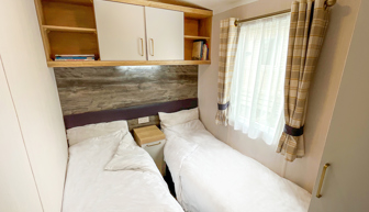 Twin Bedroom: 2 twin beds, over bed storage and small fitted wardrobe. Maximum of 6 guests.