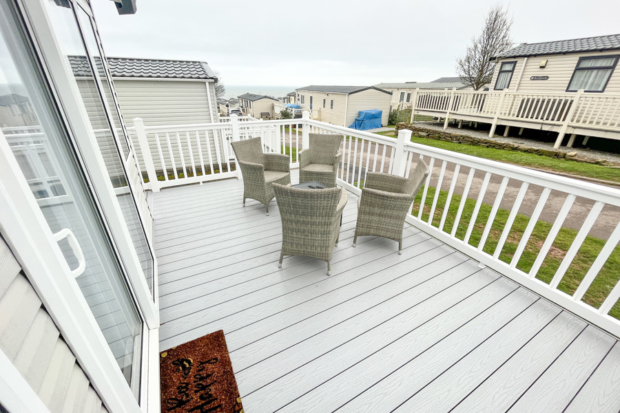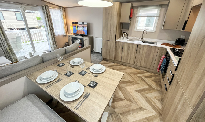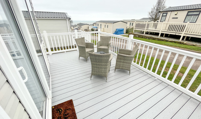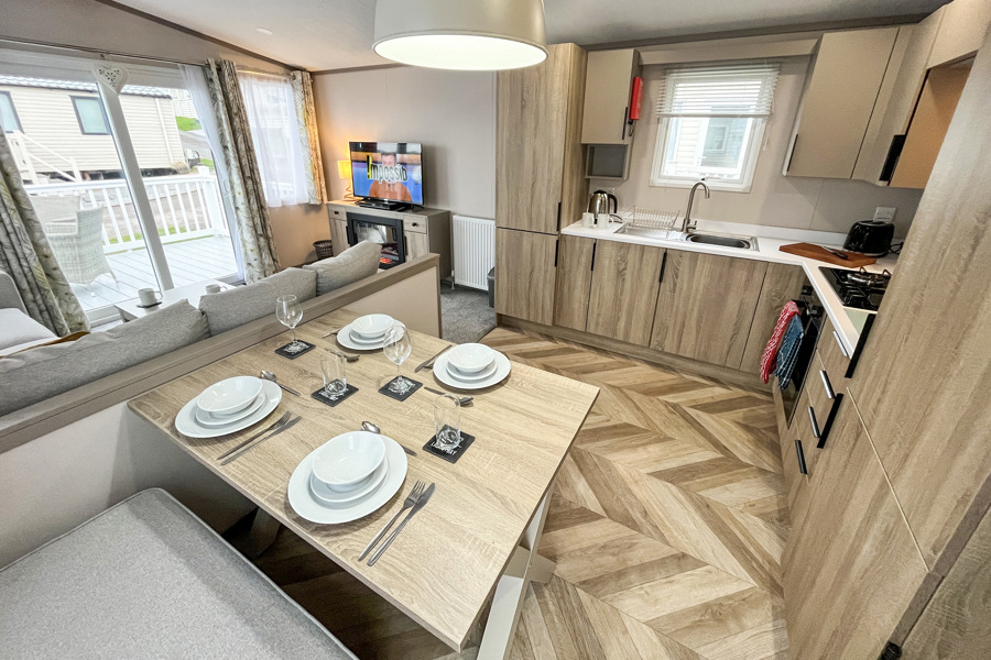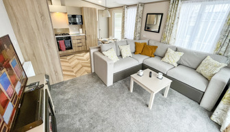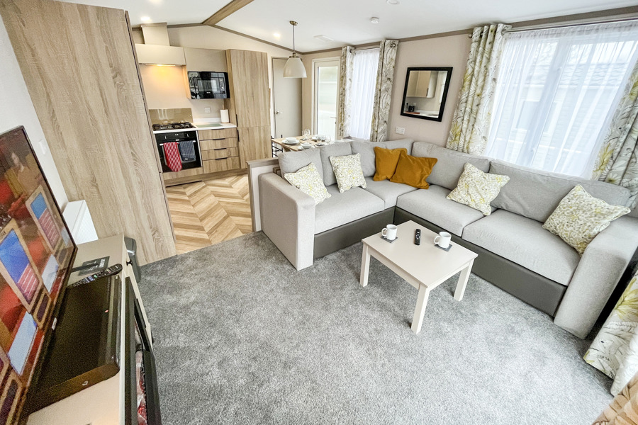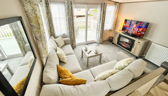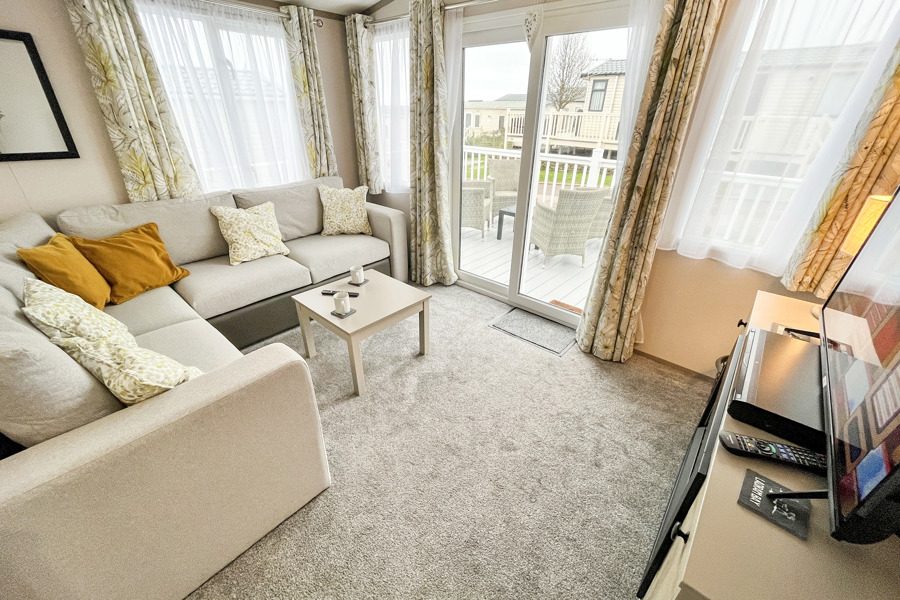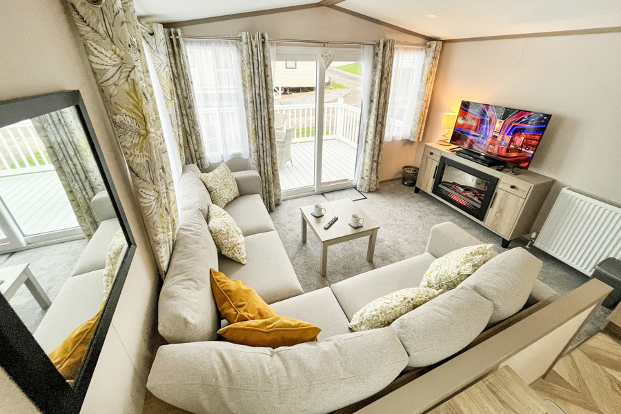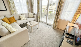 LOUNGE: Open plan with fixed L-Shape seating, Sliding patio doors on to the veranda with sea views, coffee table, flat screen TV and DVD player, electric fire. The sofa includes an occasional pull-out sofa bed for those extra guests. C147 can accommodate a maximum of 6 people.