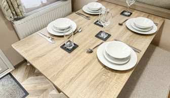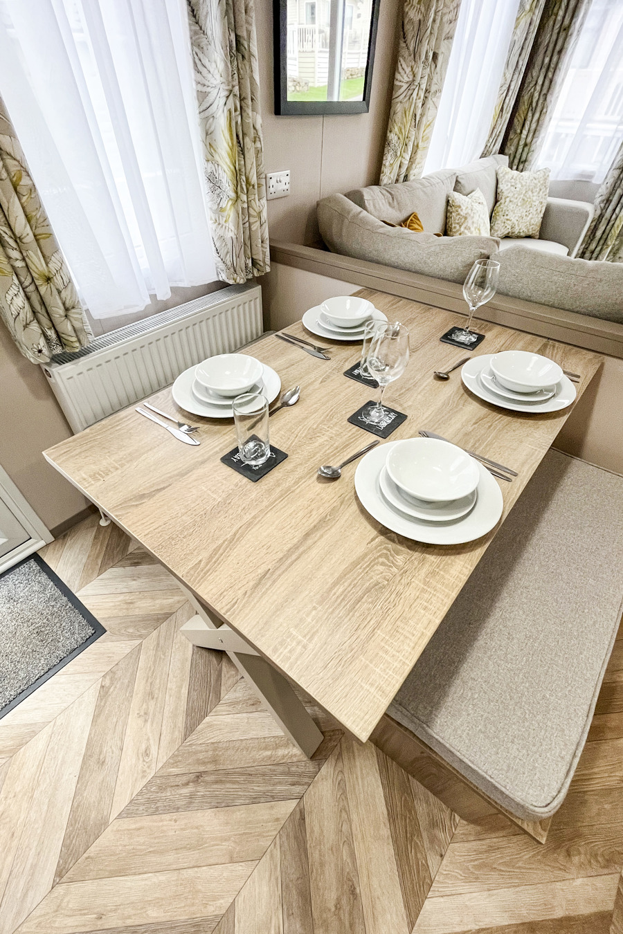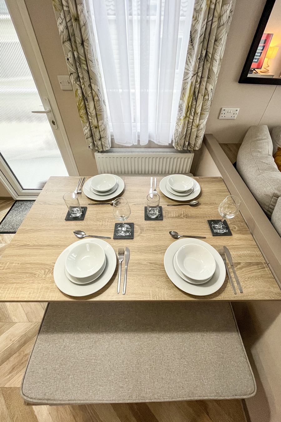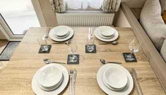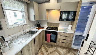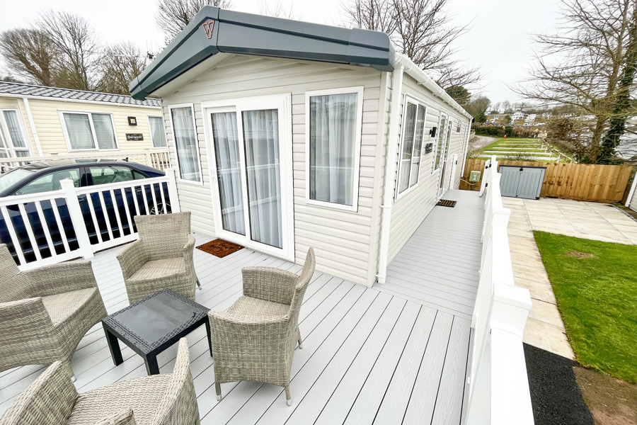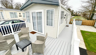 LOUNGE: Open plan with fixed L-Shape seating, Sliding patio doors on to the veranda with sea views, coffee table, flat screen TV and DVD player, electric fire. The sofa includes an occasional pull-out sofa bed for those extra guests. C147 can accommodate a maximum of 6 people.