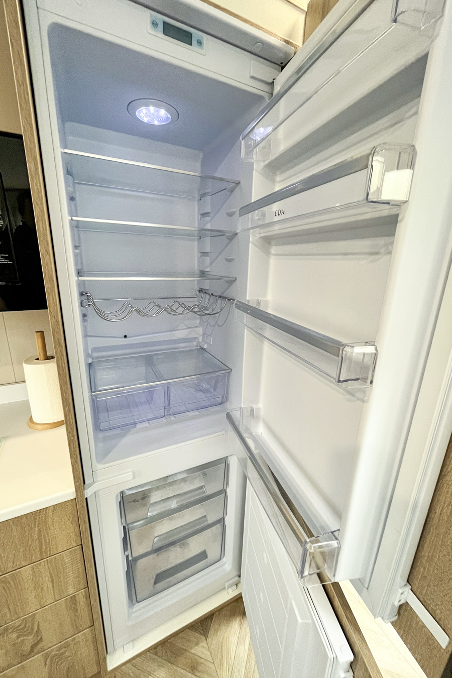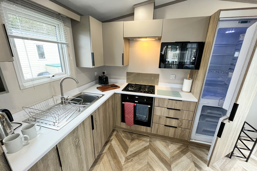 KITCHEN & DINING AREA: Equipped with necessary standard utensils, microwave, full size integrated fridge-freezer, gas oven and grill. Dining area with table and two freestanding benches.