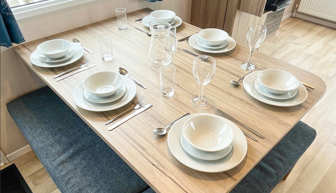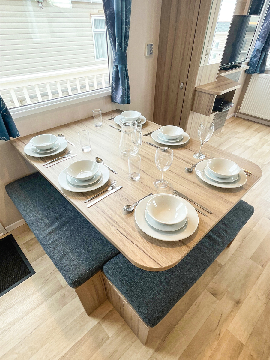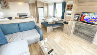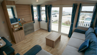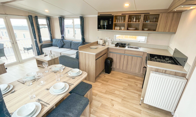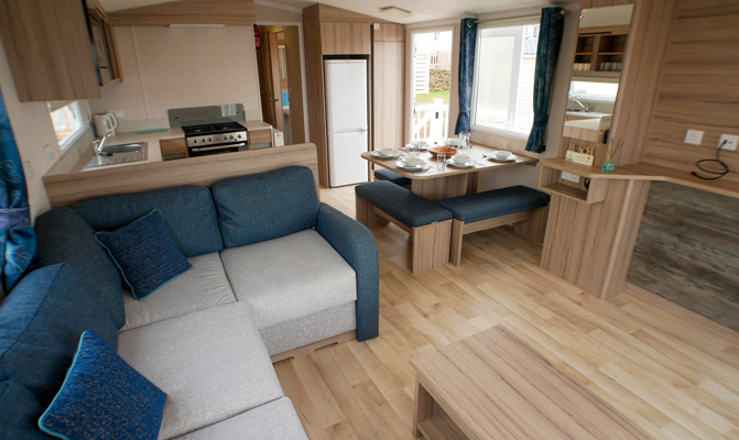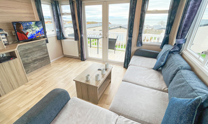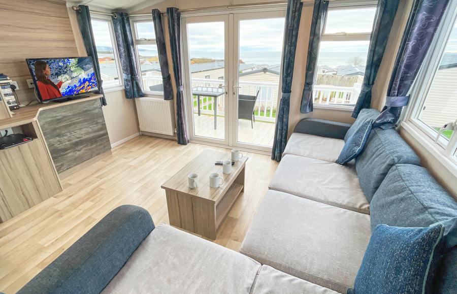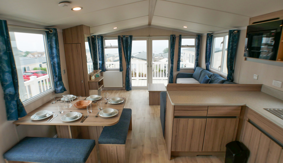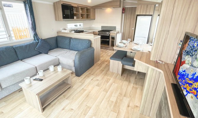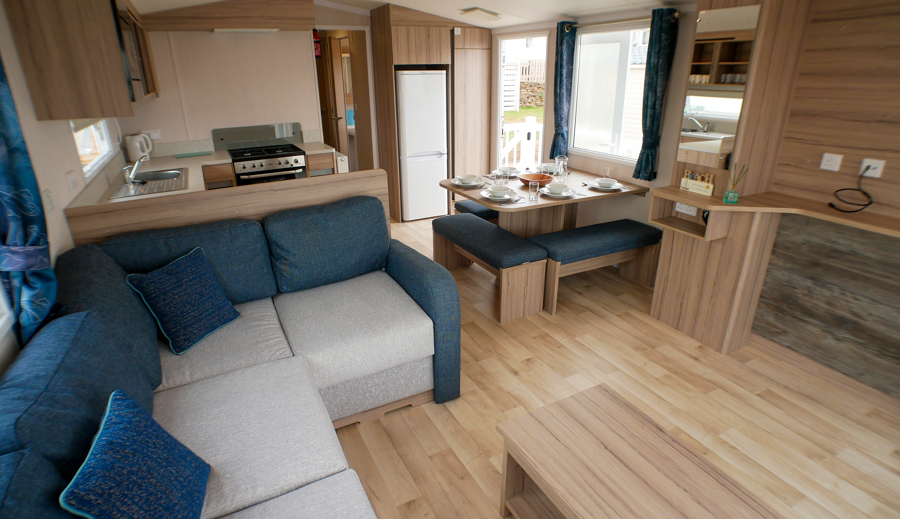 LOUNGE: C26 offers an open plan lounge and living area providing space for all the family. With wrap around fixed seating with occasional pull out bed for extra guests, flame effect electric fire, 32” LCD TV with built in DVD player and sea views.