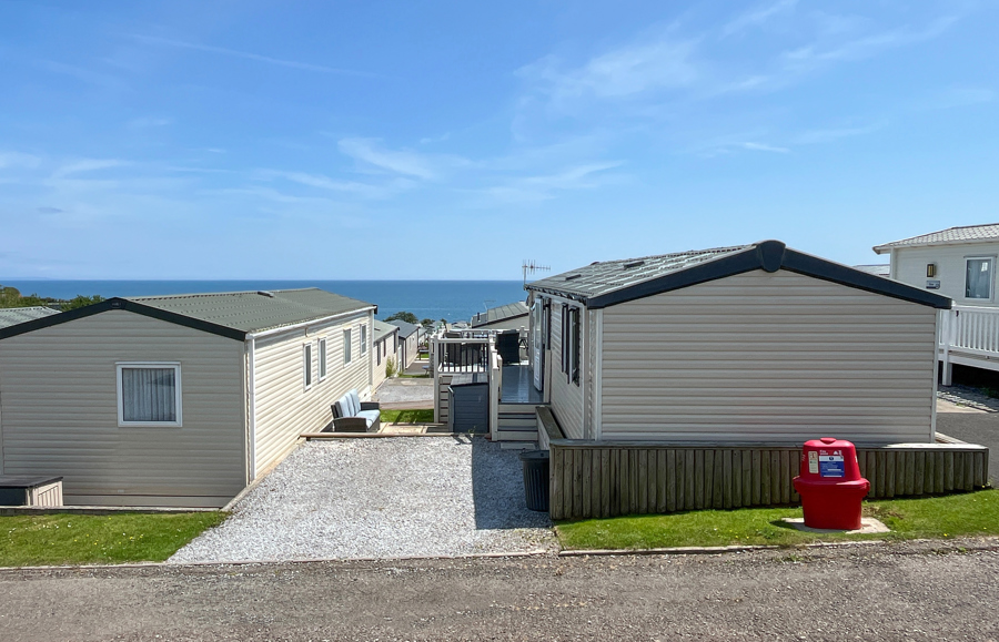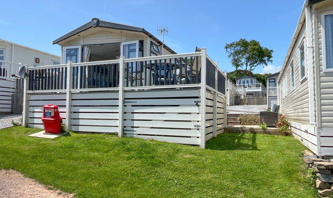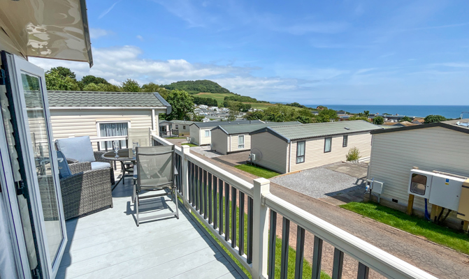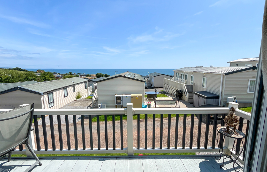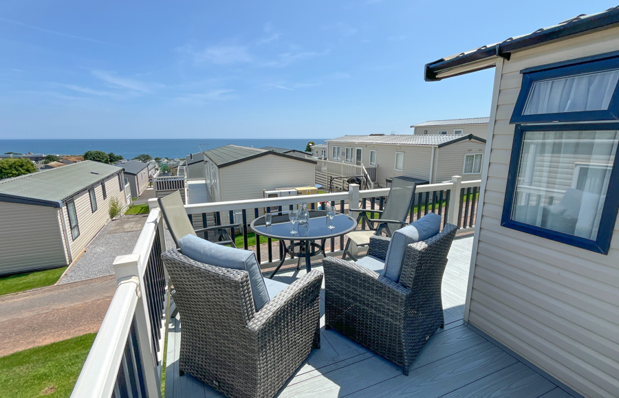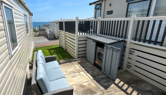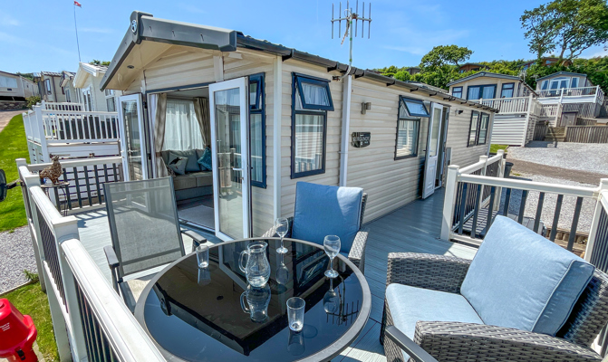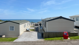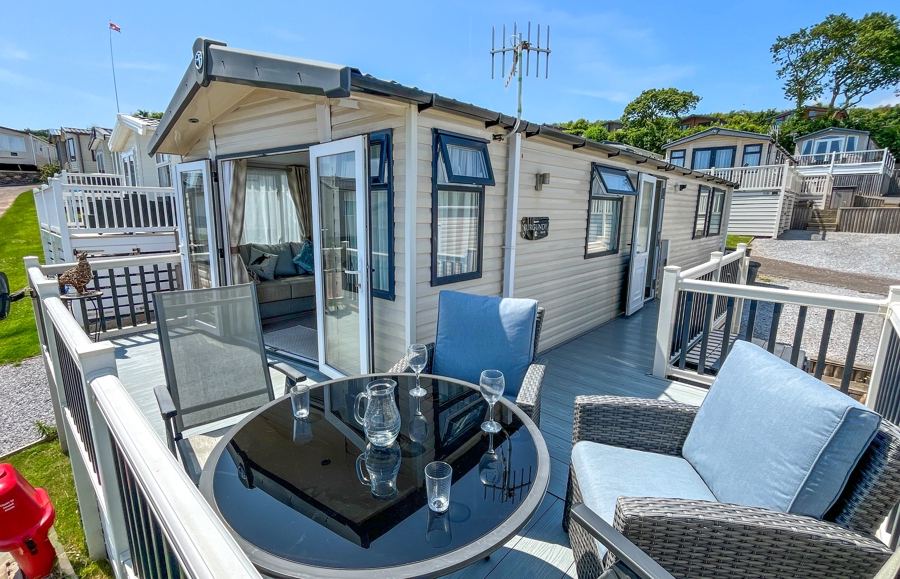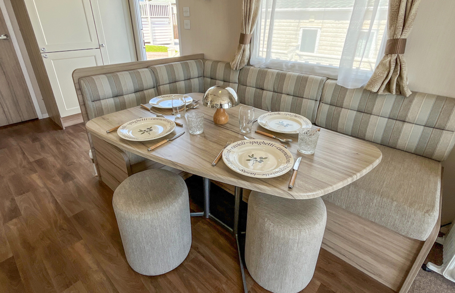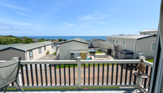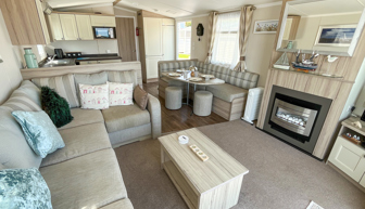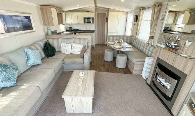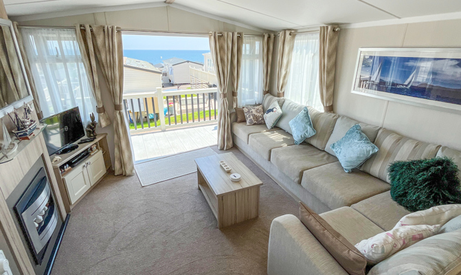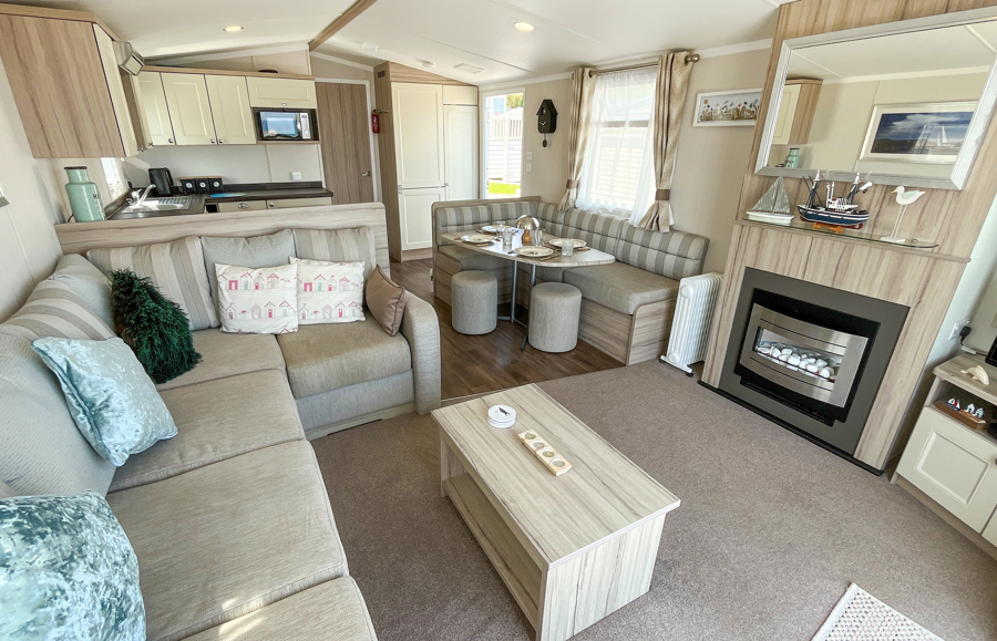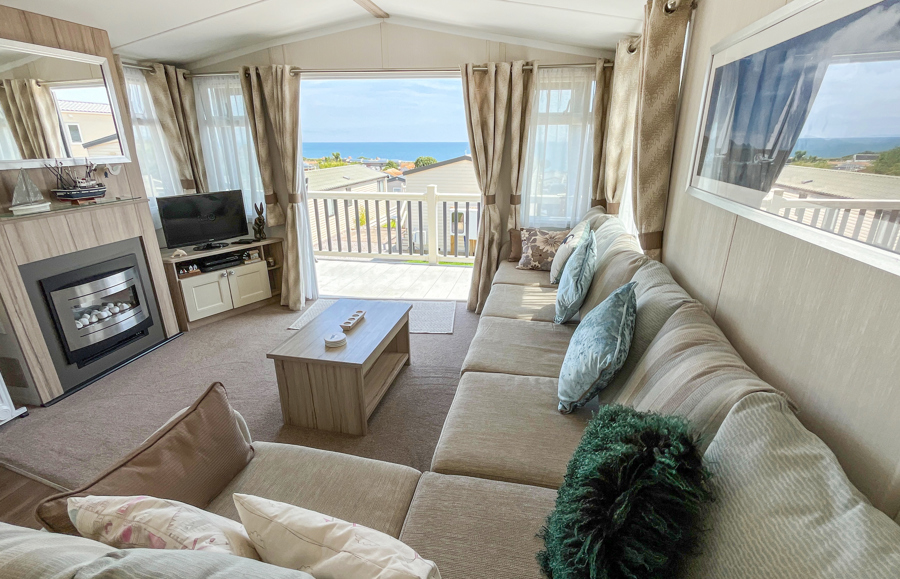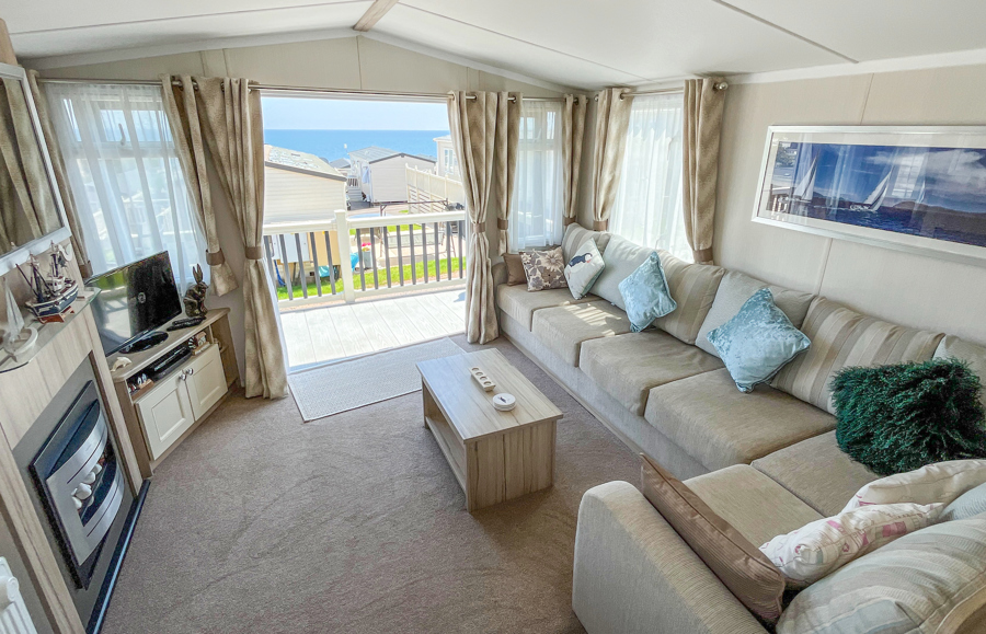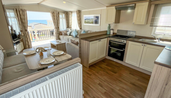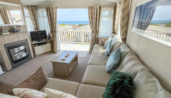 LOUNGE: Open plan design with fixed seating, French doors on to the veranda with sea views, TV with Freeview, electric fire and an occasional pull-out bed for those extra guests. Maximum of 6 guests.
