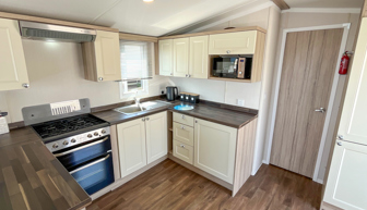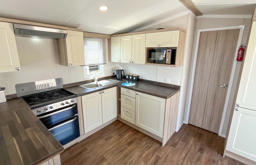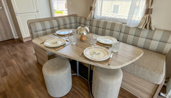 KITCHEN & DINING AREA: Kitchen equipped with necessary standard utensils, microwave, full size fridge freezer, Washing machine in exterior storage box, gas oven and grill. The dining area includes free standing table, fixed seating and two stools.