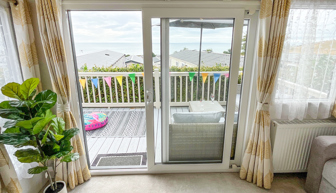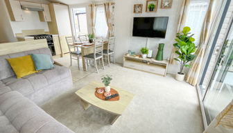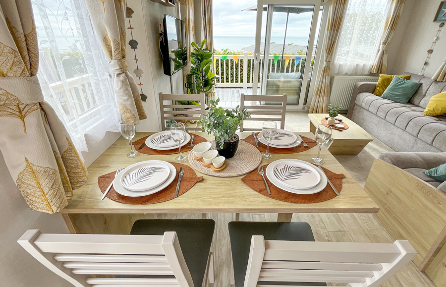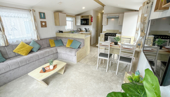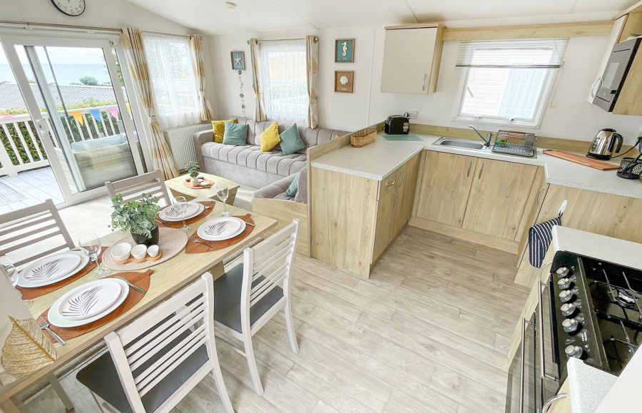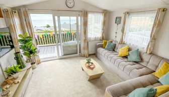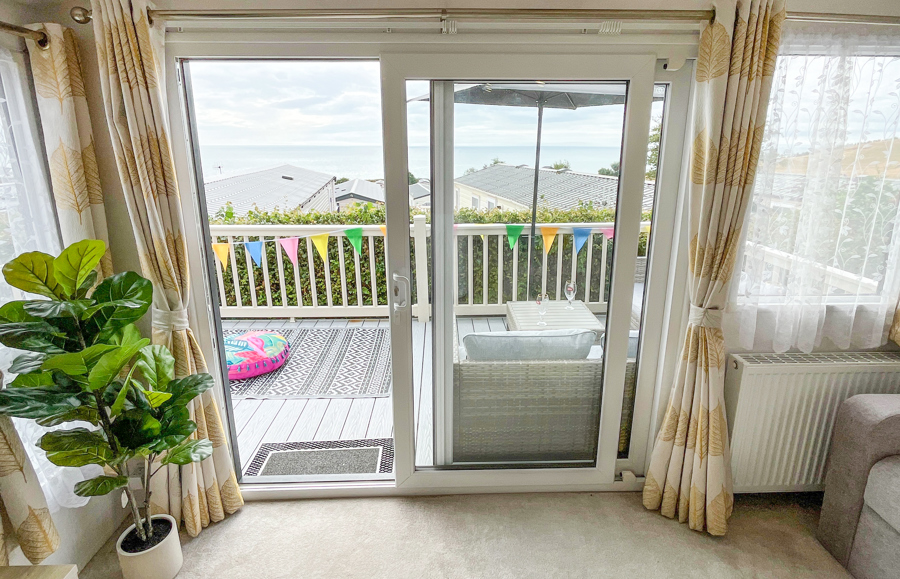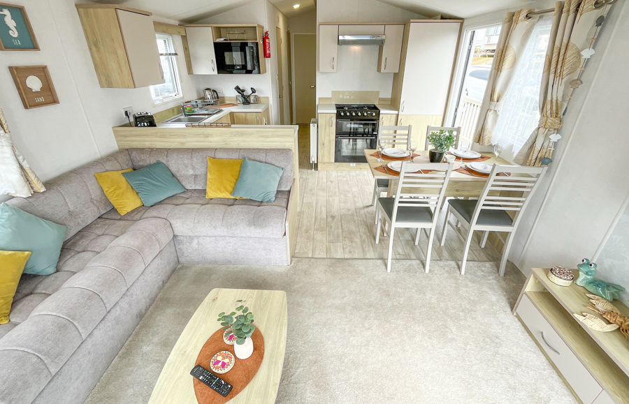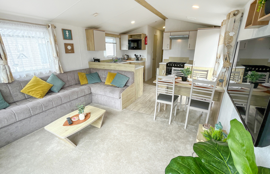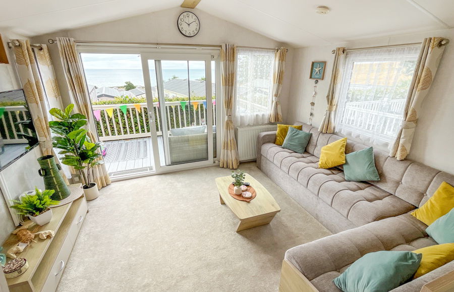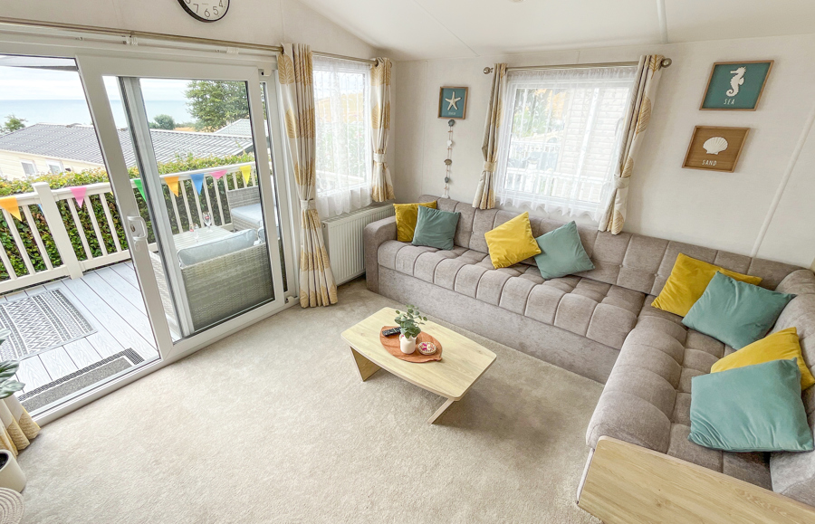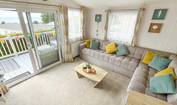 LOUNGE: Open plan lounge with fixed L seating with integrated occasional pull out bed, coffee table, wall mounted TV and patio doors opening out on to the veranda with sea views.