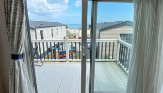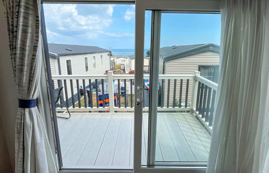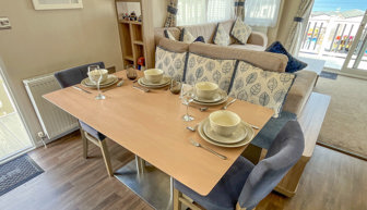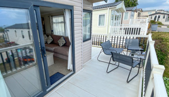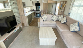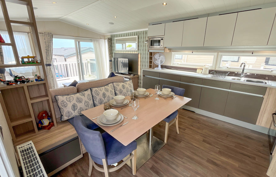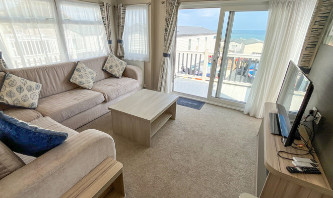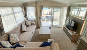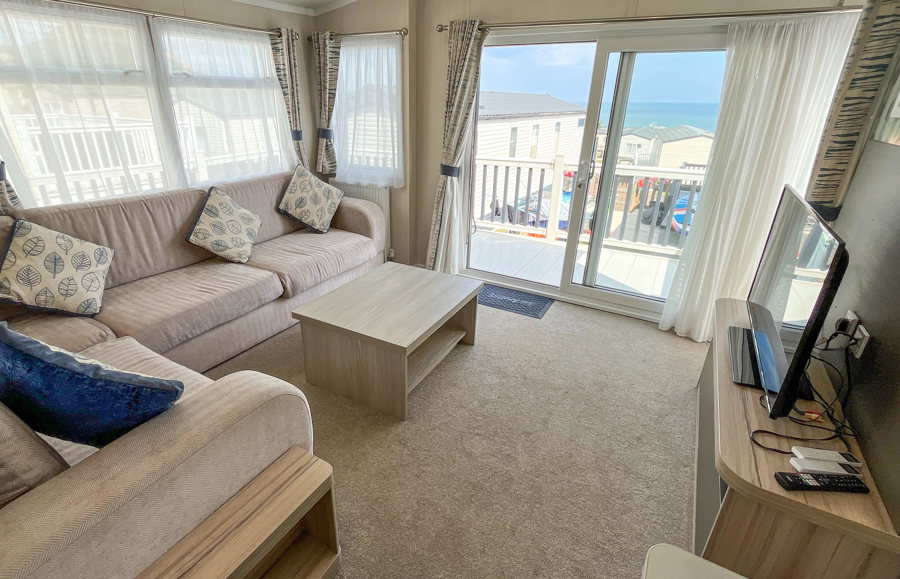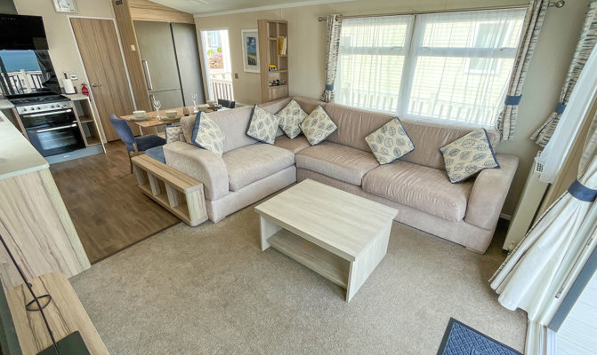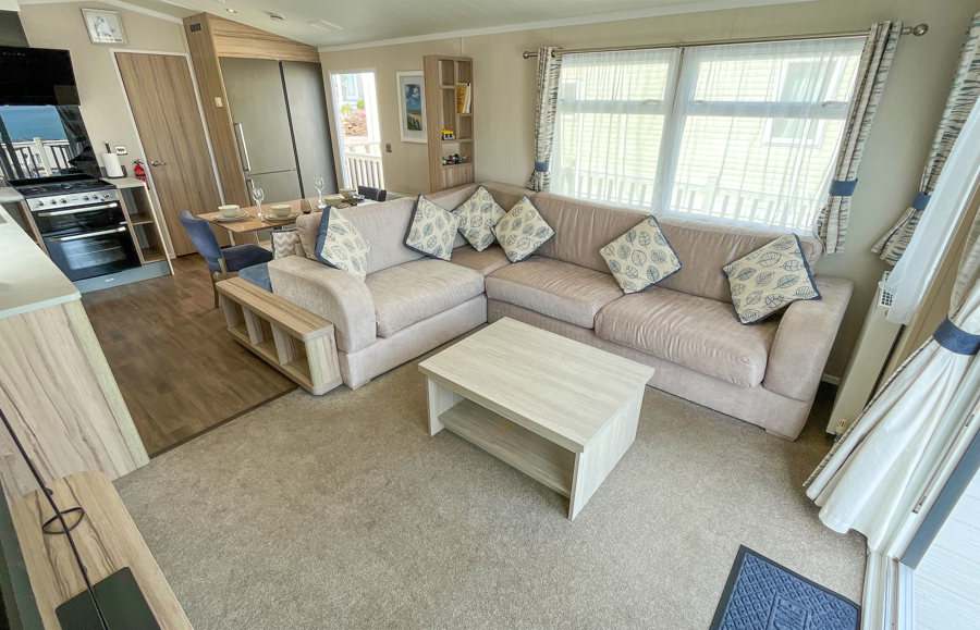 LOUNGE: Open plan with fixed L-shape seating, flat screen TV with Freeview, coffee table and patio doors onto the veranda. There is also an occasional pull-out sofa bed for additional Guests. Maximum 6 Guests.