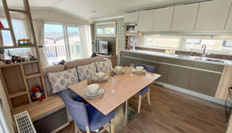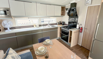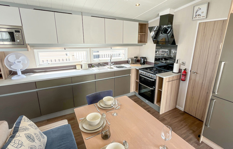 KITCHEN & DINING AREA: The kitchen is fully equipped with necessary standard utensils, microwave, full size integrated fridge-freezer, gas oven and grill. The dining area includes free standing table with bench seating and two chairs.