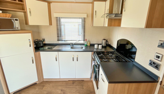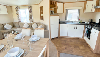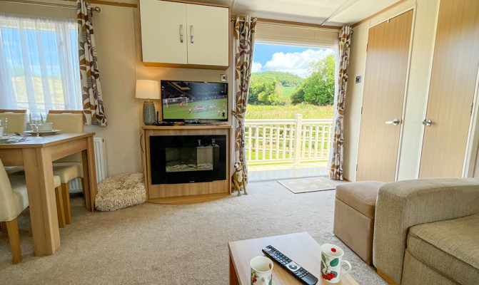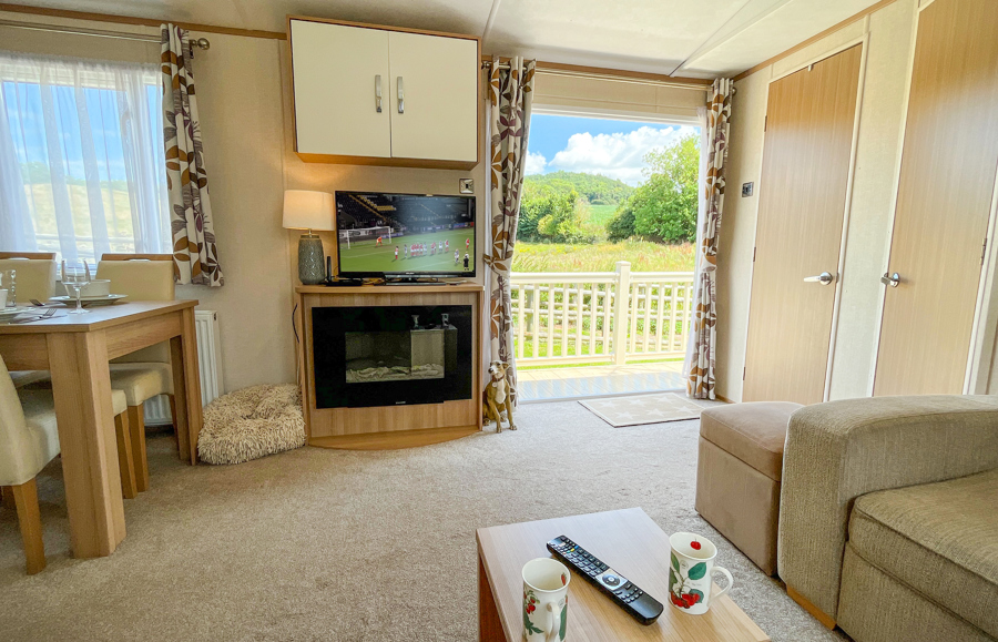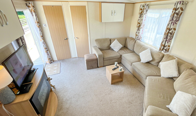 LOUNGE: F23 has a great contemporary feel, with corner seating , with integrated occasional pull out bed, electric fire with contemporary surround, 32” flat screen TV and DVD, complete with French doors to open on to the veranda.