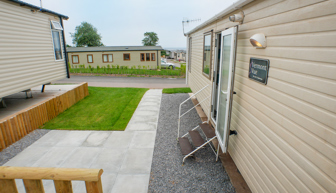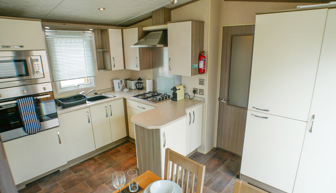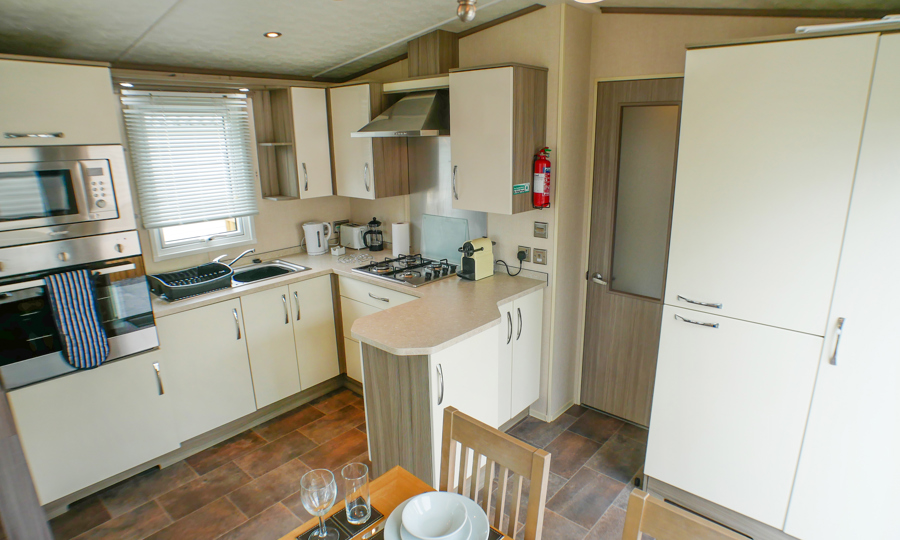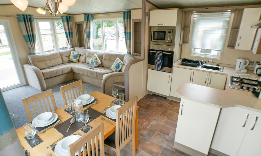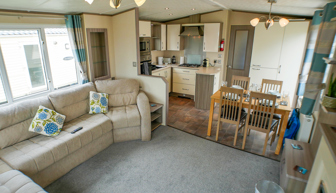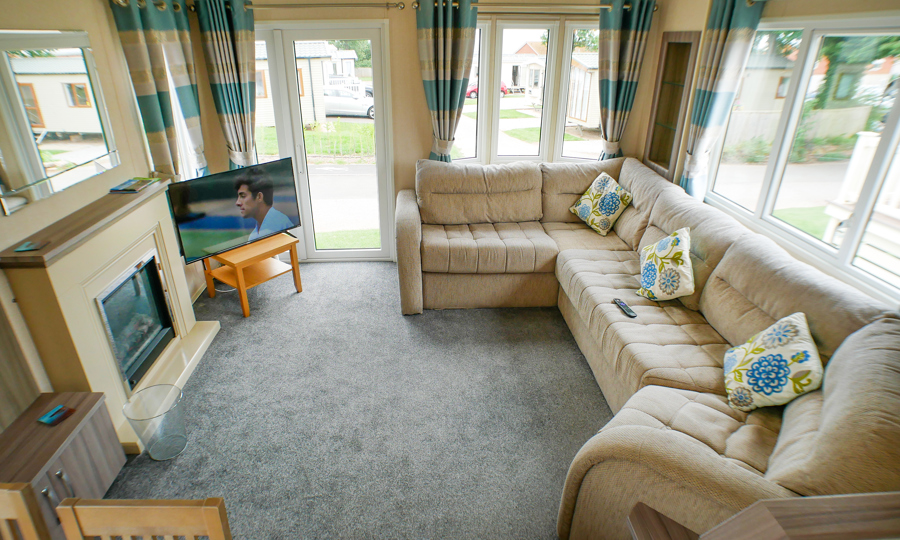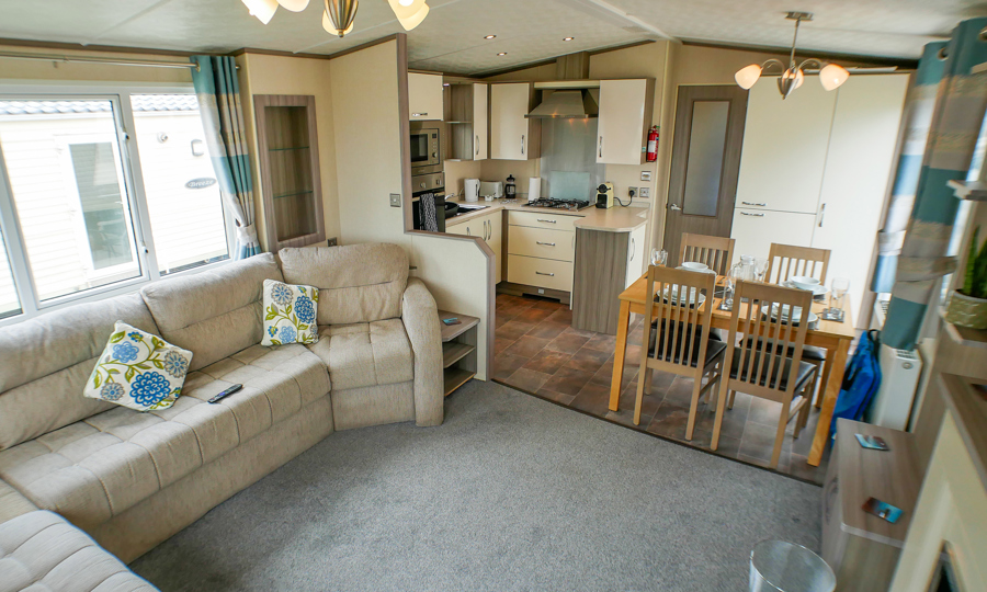 LOUNGE: Open plan design. The light and airy lounge benefits from fixed sofa seating, wall mounted TV, Freeview, DVD player, fixed units, and gas fire with surround. Occasional pull-out bed is fitted for those extra guests.