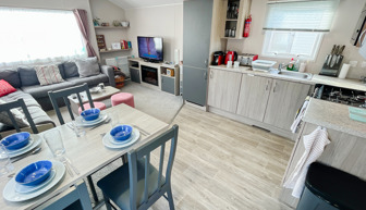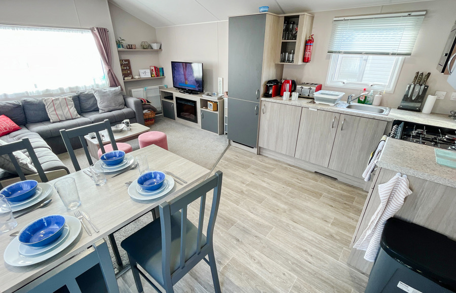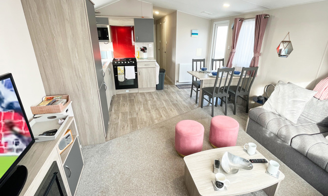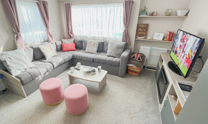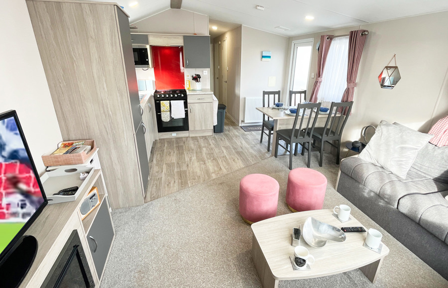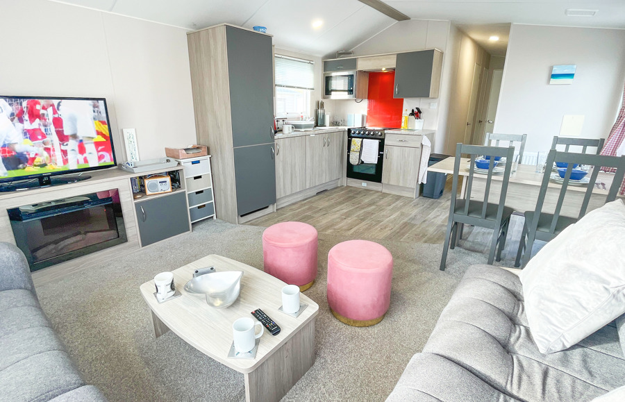 LOUNGE: Open plan design. The lounge benefits from fixed corner sofa seating and 2 stools, TV, Freeview, DVD player, fixed units and gas fire with surround. Occasional pull-out bed is fitted for those extra guests.