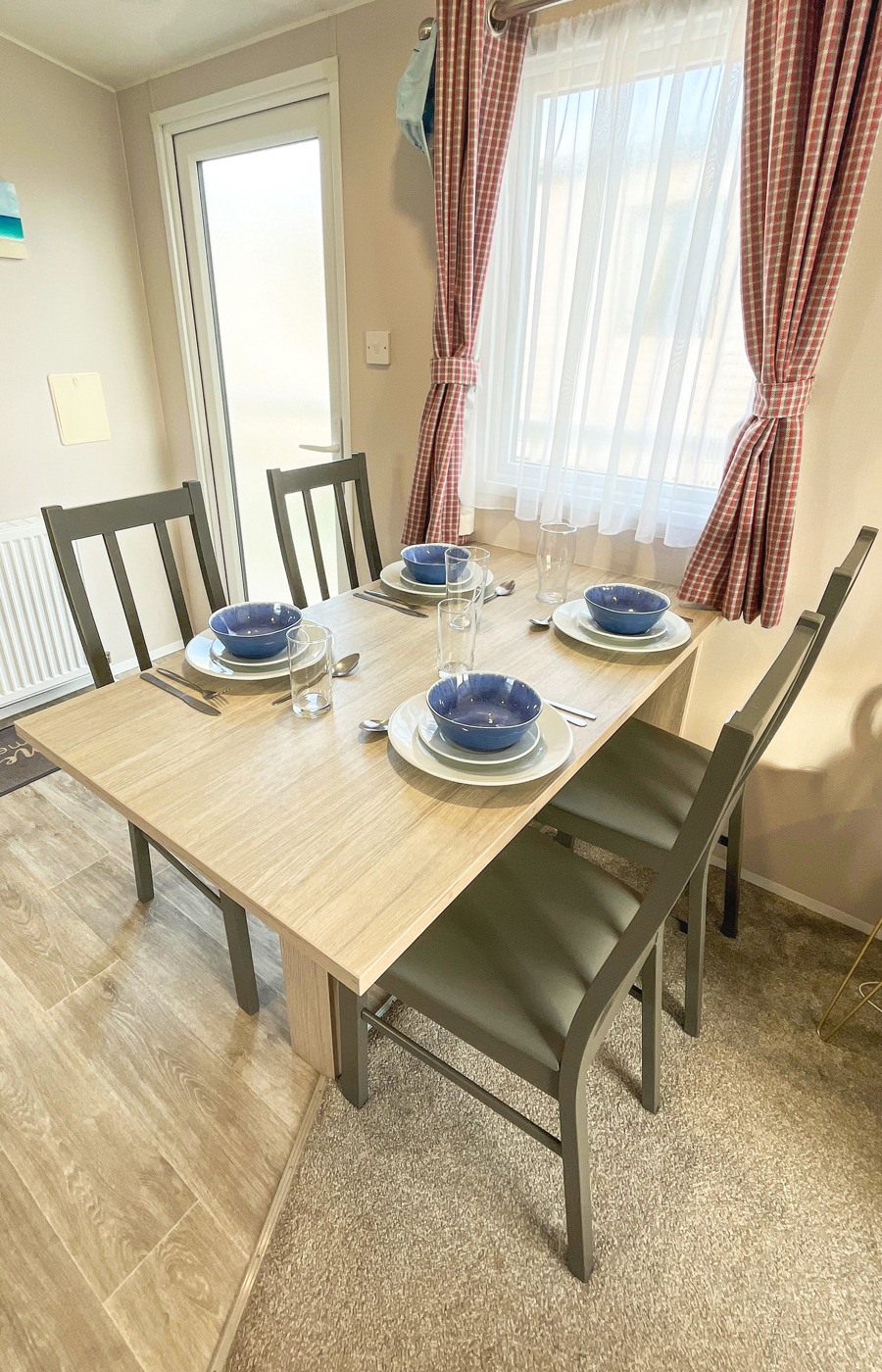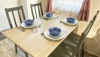 KITCHEN & DINING AREA: The well-equipped kitchen benefits from a gas hob and oven, stainless steel sink, microwave, and full-size fridge-freezer. The dining area comprises of a free-standing dining table with 4 chairs.