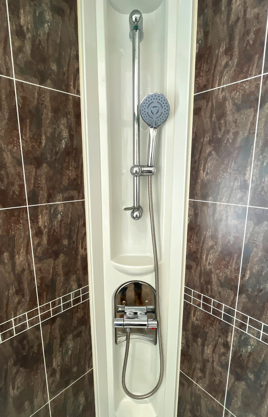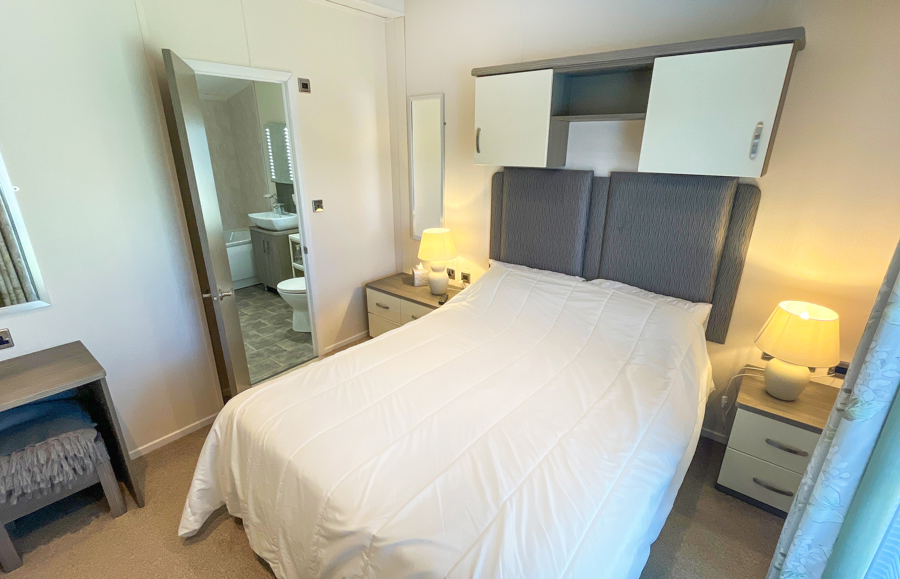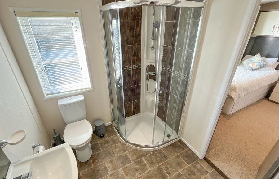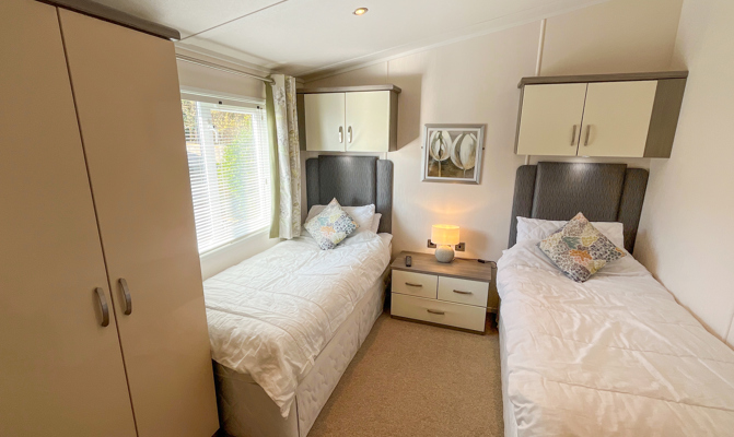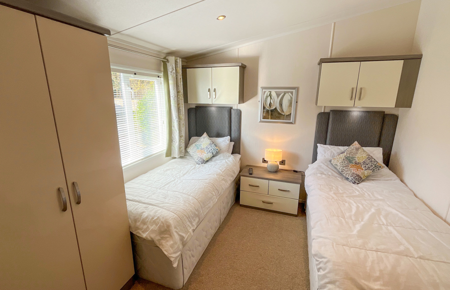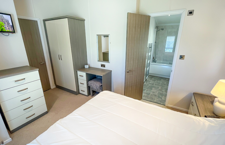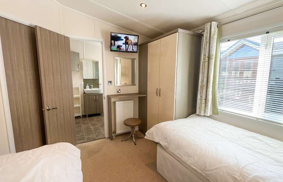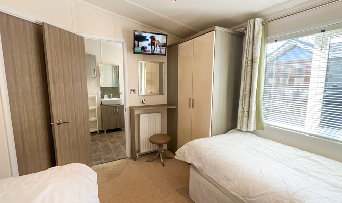 The second bedroom includes 2 twin beds, fitted wardrobe, vanity area and wall-mounted TV. The Twin room also has an ensuite shower room, with shower, toilet and wash basin. There is also a pull-out bed in the Lounge.