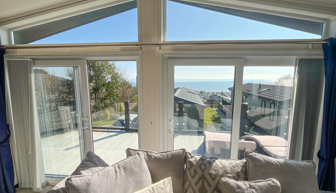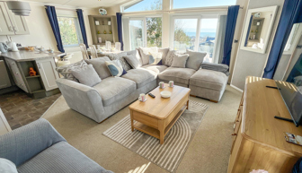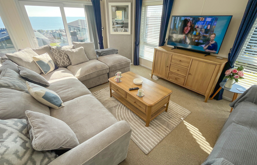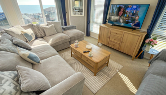 LOUNGE: Open plan with 2 free standing sofas (one fitted with an occasional pull out for those extra guests), patio doors onto the veranda, sea views, coffee table, electric fire, wall mounted TV with Freeview and DVD player and sofa-bed.