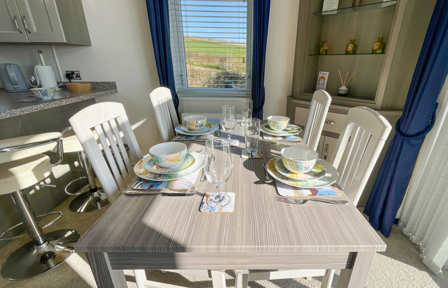 KITCHEN & DINING AREA: Equipped with necessary standard utensils, microwave, breakfast bar with stools, full size fridge freezer, gas oven and grill; dishwasher and a combi washer dryer. The dining area includes free standing table and 4 chairs.