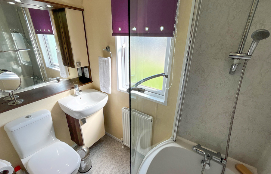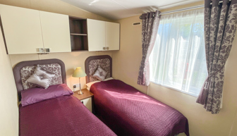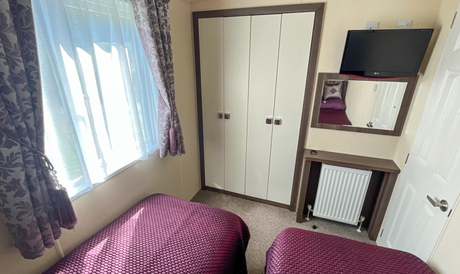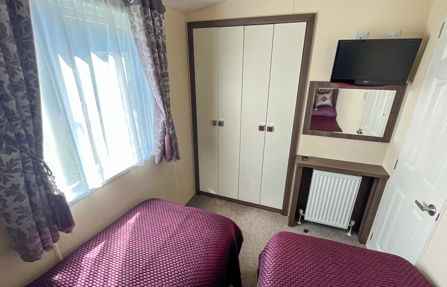 The second bedroom includes 2 twin beds with overhead storage, bedside table, fitted wardrobes, vanity area, radiator and wall-mounted TV. There is also a pull-out bed in the Lounge for additional Guests. Maximum of 6 guests.