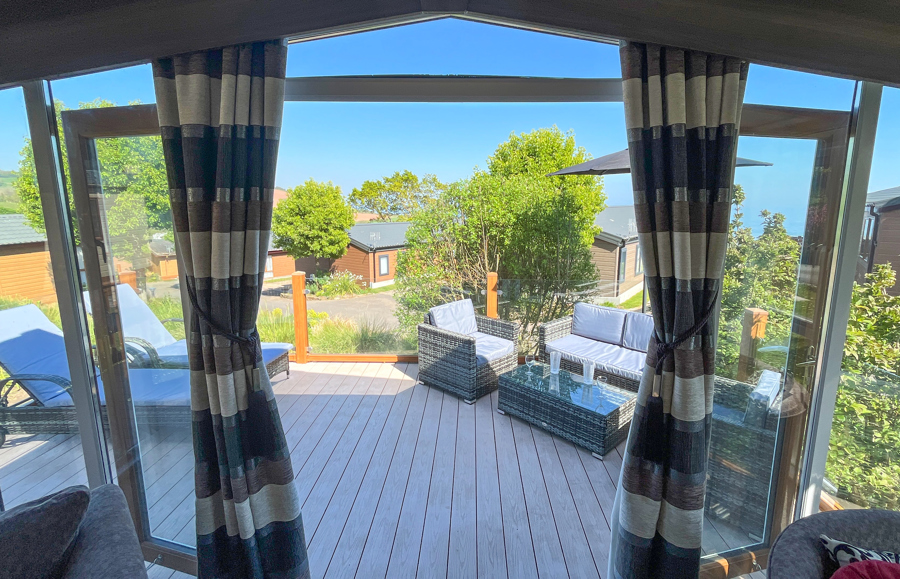 LOUNGE: Open plan with a freestanding sofa, armchair with stool, corner chair, patio doors leading to the veranda, partial sea views, coffee table, electric fire and a wall mounted TV with Freeview and DVD player.