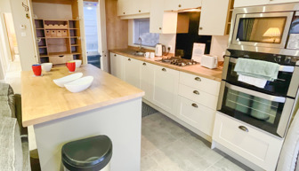 KITCHEN & DINING AREA: Equipped with necessary standard utensils, microwave, full size integrated fridge freezer, dishwasher, gas oven and grill. The dining area includes free standing table and 4 chairs.